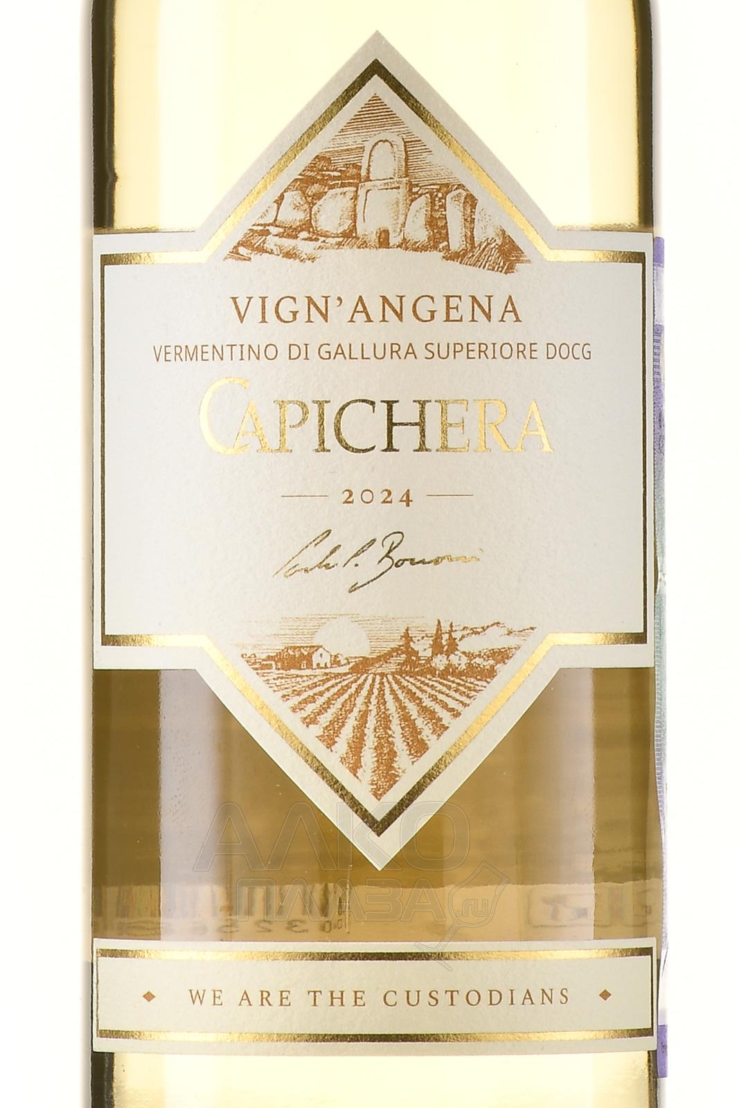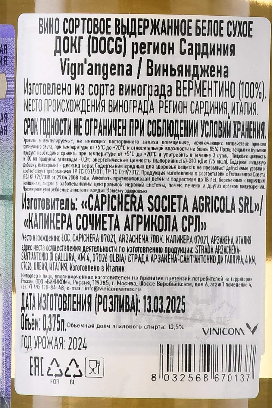 Белое сухое вино Capichera Vigna`ngena DOCG 0,375 л — одна из визитных карточек виноделия Сардинии. Оно сочетает в себе свежесть, минеральность и насыщенную ароматику. Виноград выращен в регионе Галлура, в окрестностях Олбии и Палау, на склонах с восточной и западной экспозицией. Почвы состоят из песчаника и гранита, что придает вкусу характерную минеральную ноту. Урожай собирали вручную с конца августа по начало сентября. После мягкого прессования сусло ферментировалось в резервуарах из нержавеющей стали при контролируемой температуре. Выдержка проходила в тех же емкостях, без контакта с дубом, что позволило сохранить чистоту и свежесть вкуса. Название вина в переводе с галлурского диалекта означает «чужой виноградник» — напоминание о первых виноградниках Capichera, арендованных в начале производства. Сегодня Виньянджена считается эталоном современного сардинского Верментино и отмечается критиками за чистоту сортового характера и потенциал выдержки.
