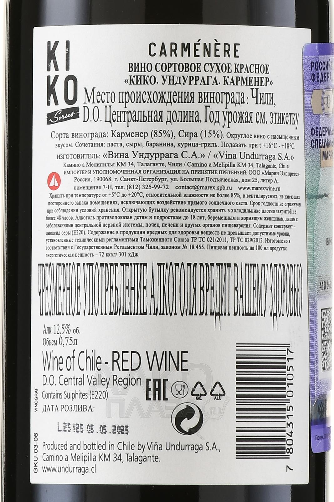 Вино Кико Ундуррага Карменер 0.75 л красное сухое изготавливается по технологии контролируемого брожения при температуре 24–26 °C с последующим 12–месячным выдерживанием в французских дубовых бочках — это придаёт структуру и мягкие нюансы специй, сохраняя при этом свежесть и фруктовость. Особое внимание уделяется сортировке и деликатной мацерации, что помогает избежать чрезмерной танинности и сохранить округлость во вкусе.