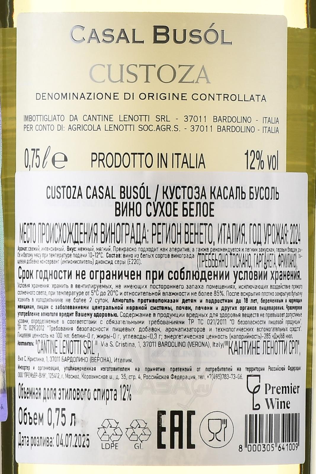 Белое сухое вино Casal Busol Custoza 0,75 л происходит из зоный Кустоца на холмах к юго-востоку от озера Гарда. Терруар представлен моренными почвами с высоким содержанием известняка, глины и минеральных включений, что формирует свежий и сбалансированный стиль напитков. Мягкое влияние водоёма смягчает климат, снижает температурные колебания и способствует постепенному созреванию ягод. Для купажа используют несколько традиционных местных сортов, каждый из которых винифицируется отдельно. Сбор проводят при оптимальной зрелости. Ферментация проходит в стальных ёмкостях с температурным контролем, без контакта с дубом, что позволяет сохранить чистоту ароматики и прозрачность вкуса. Напиток ориентирован на свежесть, лёгкость и гастрономическую универсальность.