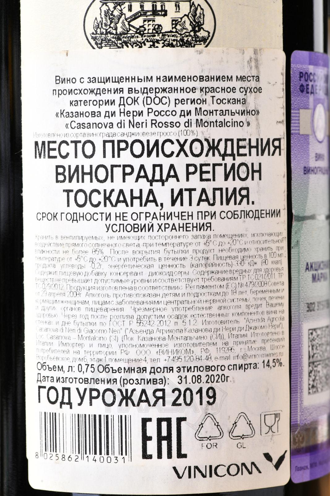 Красное сухое вино Casanova di Neri Rosso di Montalcino 0,75 л получают из одного сорта винограда, произрастающего на плантациях Монтальчино винодельческой зоны в Тоскане. Ягоды собирают вручную в первых числах октября, подвергают мацерации и ферментации на протяжении 18 дней. Сбраживание осуществляется на природных дрожжах при контролируемой температуре в стальных конических ферментерах. Когда процесс брожения завершается, вино переливают в дубовые бочки, где выдерживают 12-15 месяцев. Финишную отделку напиток проходит в бутылках на протяжении нескольких месяцев. Потенциал спиртного достигает 10-15 лет.