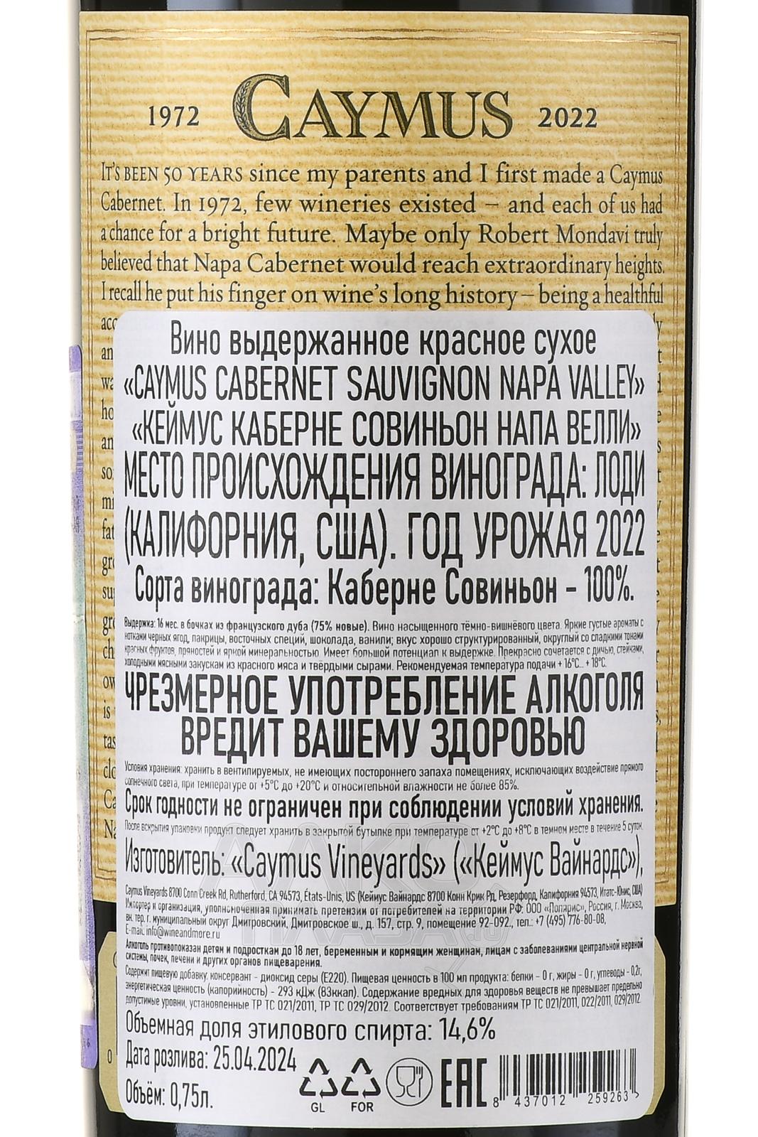 Caymus Napa Valley Cabernet Sauvignon - очень ценное красное сухое вино, произведенное из смеси ягод Каберне Совиньон с нескольких участков калифорнийского апелласьона Долина Напа. Возраст низкоурожайных лоз, с которых был собран урожай, составляет не менее 40 лет. Винификация для сырья с каждого участка проводилась отдельно. Сусло старело в дубе не менее 16 месяцев, а на финальном этапе проводилось купажирование. Благородное вино имеет классическую крепость 14.6%.