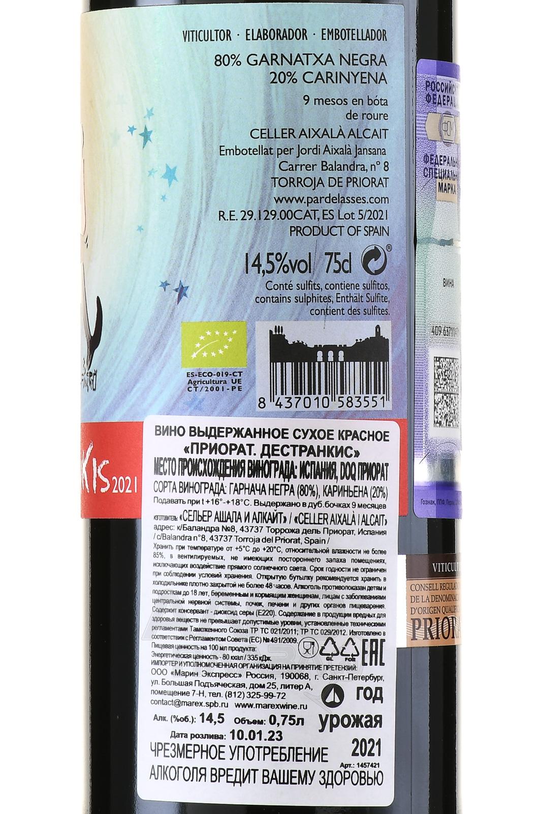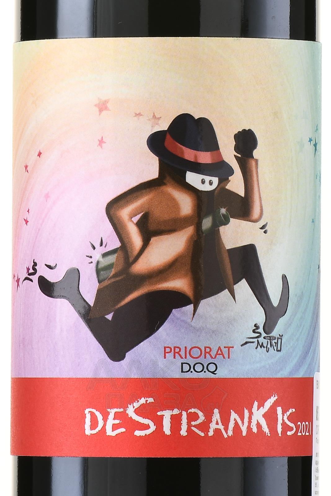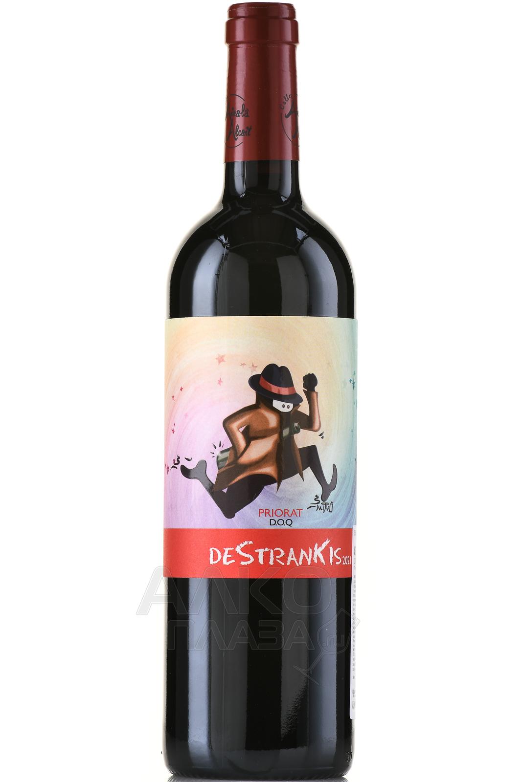 Красное сухое вино Celler Aixala I Alcait Destrankis Priorat DOC 0,75 л производится в регионе Приорат и демонстрирует насыщенный вкус. Виноград поступает с двух участков со сланцевыми, на одном из которых растут молодые лозы Гарначи, на другом — старые лозы Кариньяно. Высота — 350-400 метров. Работы на виноградниках ведутся по принципам устойчивого и биодинамического земледелия. Химические средства не применяются, участки сертифицированы органическим советом Каталонии. Урожай собирают вручную. Ягоды мягко дробят и ферментируют в небольших стальных чанах с регулярным ручным пижажем. Мацерация длится около 10 дней. Затем вино выдерживается 9 месяцев в бочках из французского и американского дуба повторного использования. Название Destrankis связано с историей контрабанды в эпоху Франко и отражает независимый характер проекта.