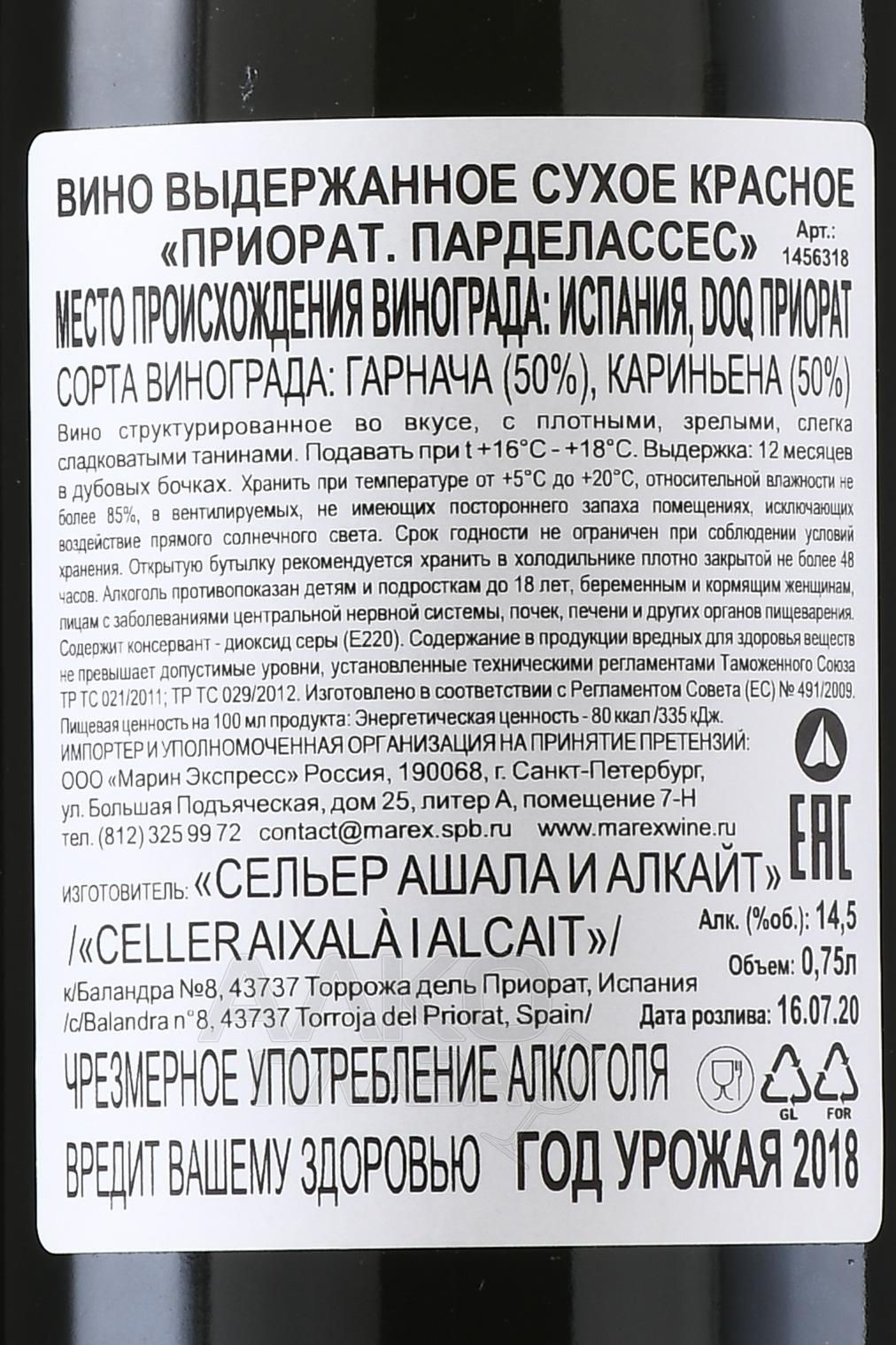 Красное сухое вино Celler Aixala I Alcait Pardelasses Priorat DOC 0,75 л создается в регионе Приорат и отражает характер местного терруара. Виноград выращивается на органических участках, расположенных на высоте от 285 до 500 метров, где каменистые почвы и сухой климат формируют концентрированный вкус ягод. Урожай собирают вручную. Ягоды аккуратно дробят и отправляют на ферментацию в небольшие стальные емкости объемом около 1000 литров. В процессе активно применяется ручной пижаж. Это позволяет извлечь цвет и структуру без перегрузки танинами. Затем вино выдерживается около 12 месяцев в французских дубовых бочках, после чего дополнительно развивается в бутылке не менее полугода. Его стиль яркий и насыщенный. Оно получает положительные оценки за аутентичность и точную передачу особенностей региона.