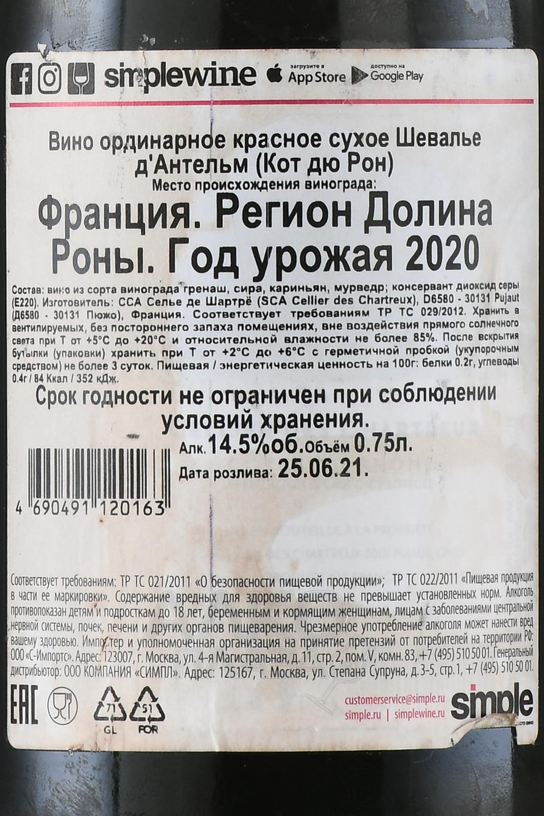Красное сухое вино Cellier des Chartreux Chevalier dAnthelme Rouge Cotes du Rhone AOP 2016 г 0,75 л производится из 5-ти темных сортов с плантаций апелласьона Кот-дю-Рон. Сырье выращивается на глинисто-известняковых и галечных почвах. Винификация протекает в рамках традиционной технологии, процесс завершает 30-дневная мацерация. Вино Шевалье д`Антельм Руж является обладателем нескольких золотых и серебряных наград.