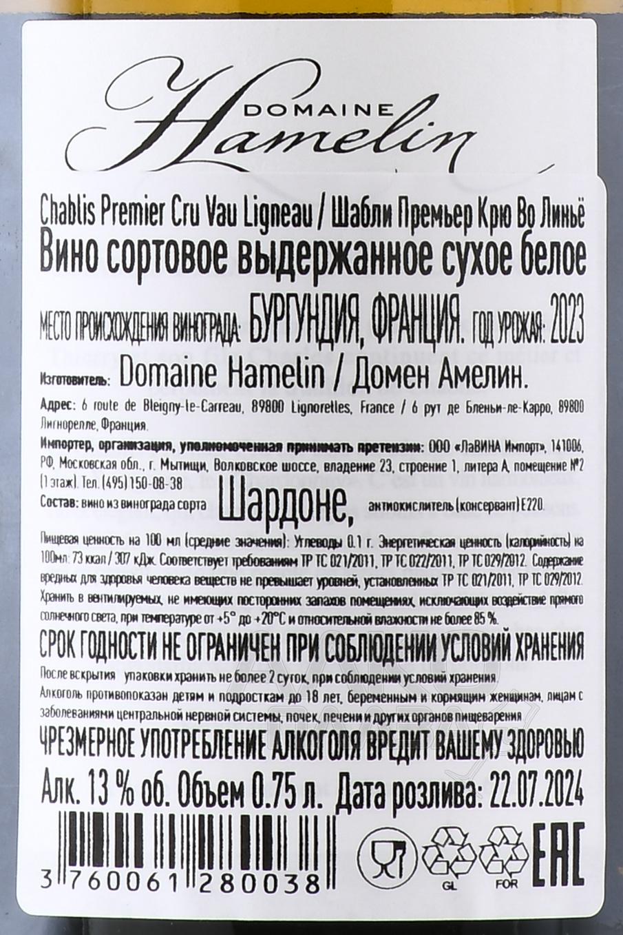 Белое сухое вино Thierry Hamelin Chablis Premier Cru Vau Ligneau 0,75 л – изысканный образец шабли из престижного французского терруара. Виноград для винификации собирают в местности Во Линье. Местные виноградники носят высокий статус Премьер Крю. Виноградники на них высажены с 1978-1980 годах. Лозы произрастают на очень крутых склонах, хорошо согревающейся солнцем. Благодаря обилию тепла и света, плоды хорошо вызревают. В дальнейшем виноградное сусло помещают в стальные чаны, где оно ферментируется и выдерживается на осадке.