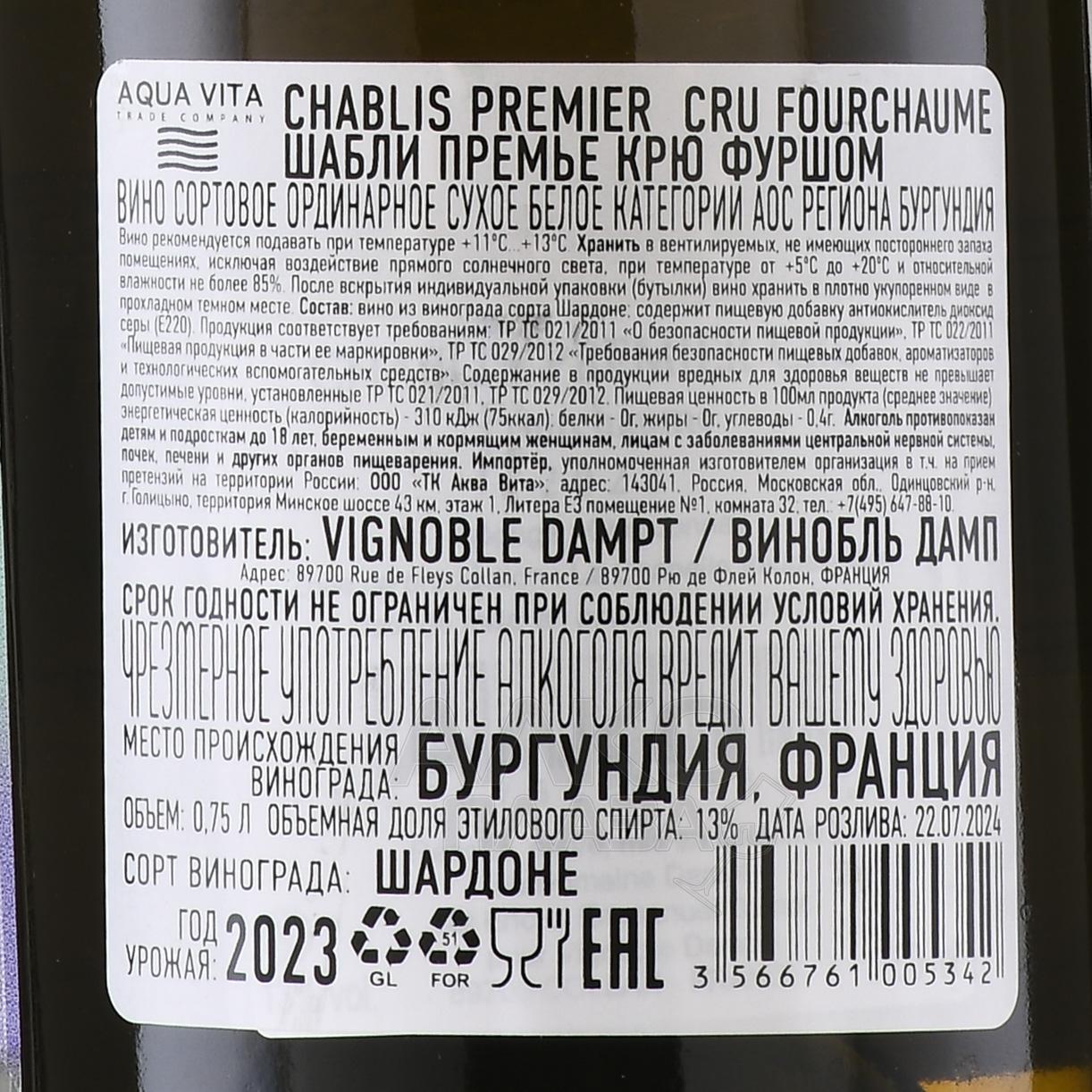 Белое сухое вино Chablis Premier Cru Fourchaume 0,75 л на 100% состоит из винограда определенной вариации, собранного с пятидесятилетних лоз местности Фуршом во французской винодельческой области Шабли (регион Бургундия). 13-градусный алкоголь создали на классическом оборудовании посредством ферментации с температурным контролем и выдержки в двух типах тары: стальной и древесной. Вино обладает долгим потенциалом хранения (свыше 10 лет), на протяжении которого предполагается развитие вкусоароматических штрихов.
