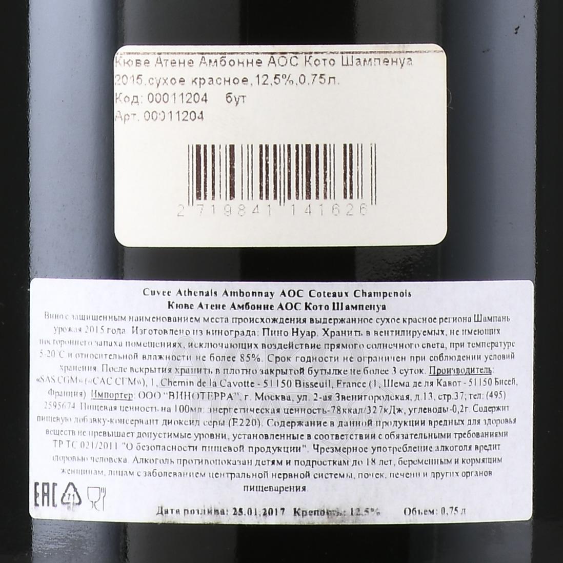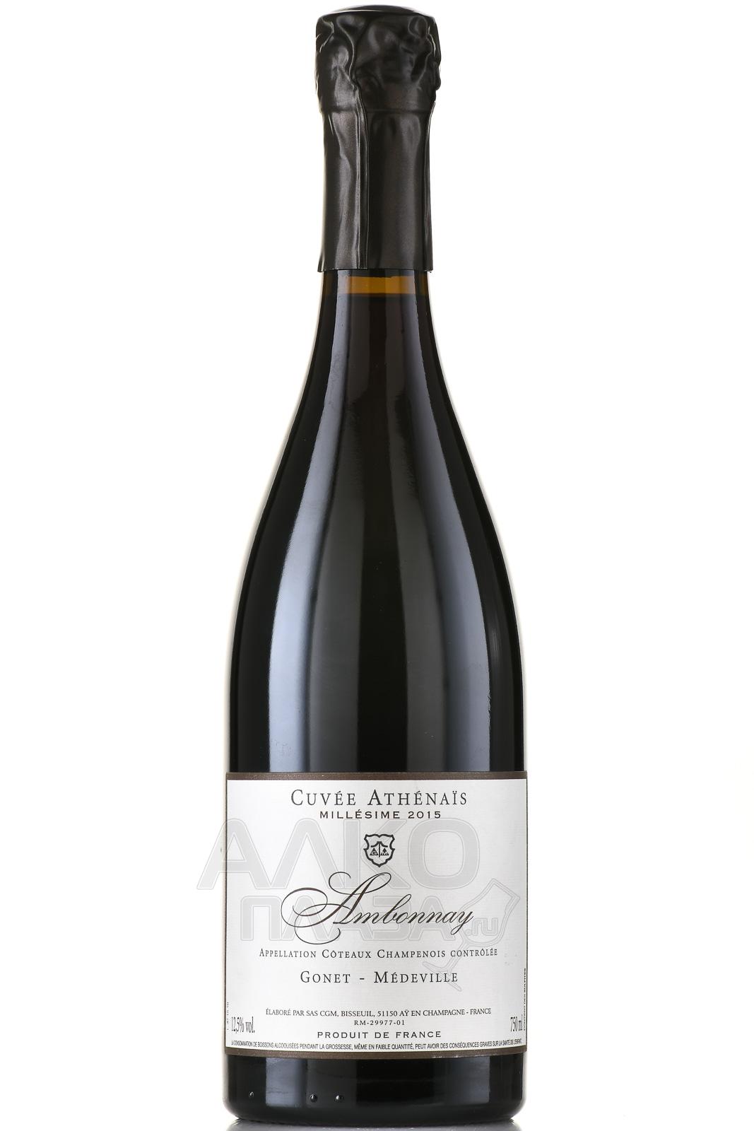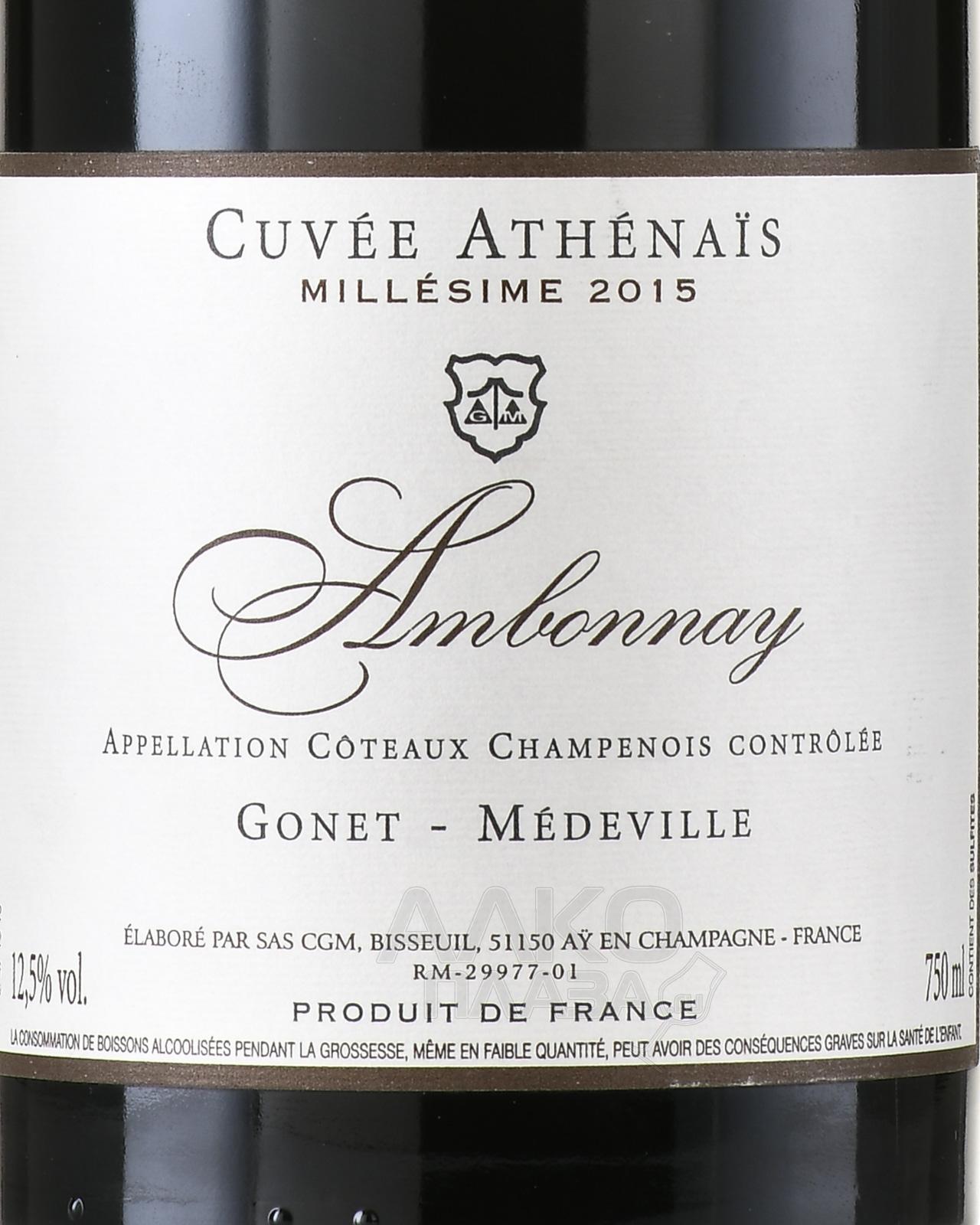 Красное сухое вино Champagnes Gonet-Medeville Cuvee Athenais Ambonnay Coteaux Champenois AOC 2015 г. 0,75 л — элитный спиртной напиток из региона Франции Champagne, представленный в тихой категории. У него моносортовой состав на основе винограда одного года урожая, собранного с лоз старого возраста ручным способом. Алкоголь винифицировался по стандартному алгоритму и долго (свыше 18 месяцев) выдерживался в дубе (бочонках первого и повторного наполнения).