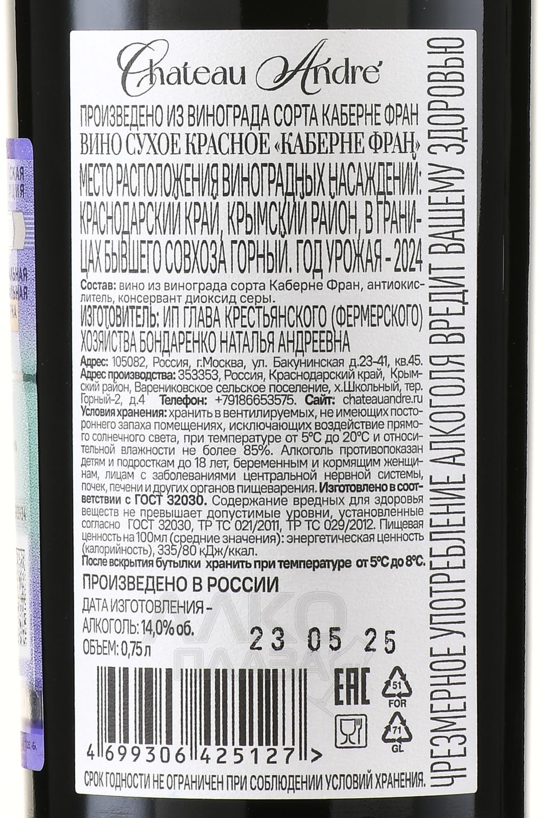 Красное сухое вино Chateau Andre Cabernet Sauvignon 0,75 л. отражает характер терруара и сорта Каберне Совиньона. Он был выращен на виноградниках Крымского района Краснодарского края в границах бывшего совхоза «Горный». Урожай собирали вручную в оптимальной степени зрелости, что позволило сохранить естественную концентрацию вкуса. После тщательной сортировки ягоды проходили бережное прессование, затем осуществлялась винификация по традиционному европейскому методу производства красных вин. Выдержка проводилась в стальных емкостях, что позволило подчеркнуть изящные фруктовые и пряные оттенки, сохраняя естественную свежесть и баланс.