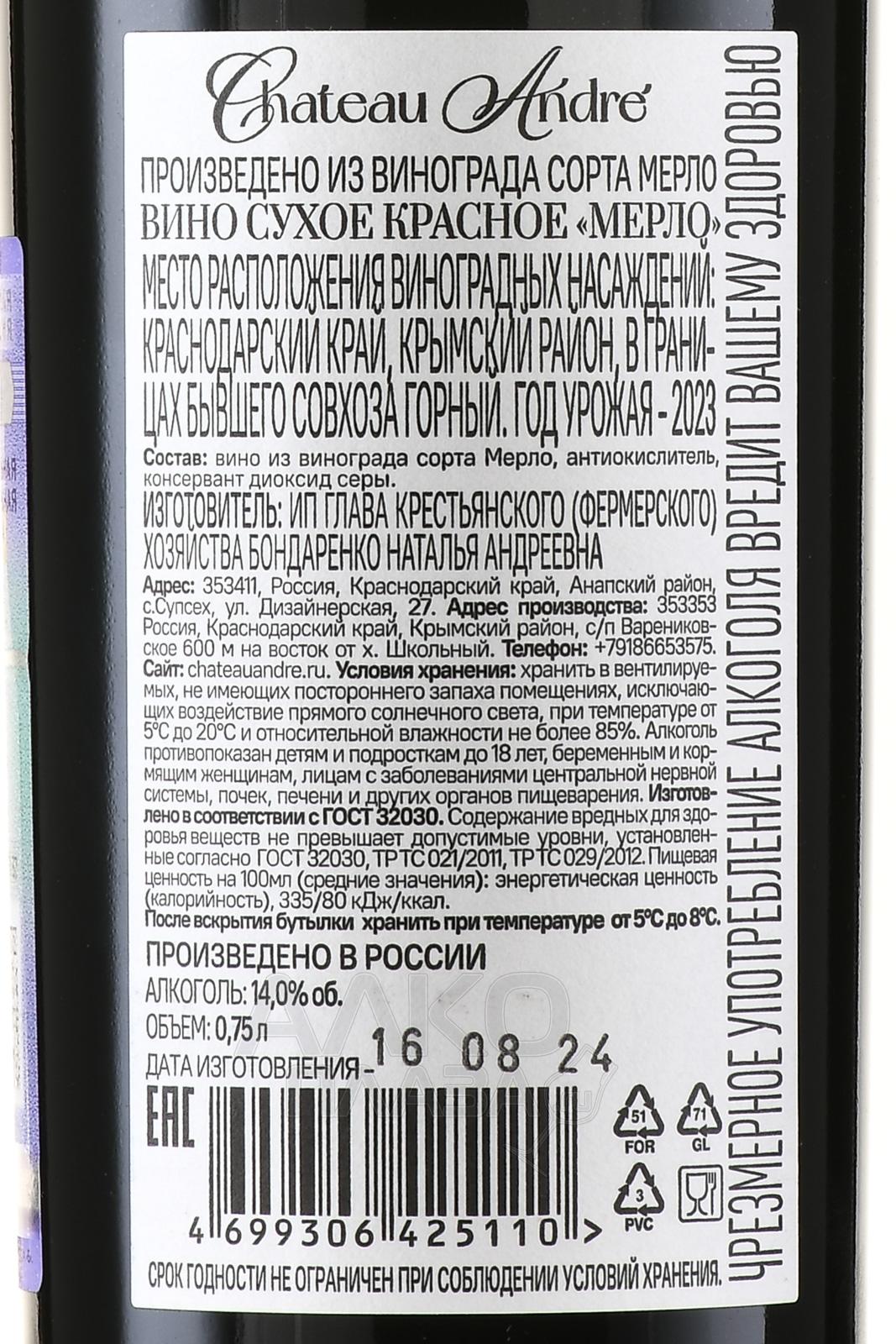 Красное сухое вино Chateau Andre Merlot 0,75 л произвели из спелого винограда, который собрали ручным и механическим способами в плодородных областях Краснодарского края. Урожай одного года обработали на оборудовании небольшого семейного хозяйства с применением мацерации и контролируемой ферментации. Благодаря отсутствию выдержки, вино отличается демократичной стоимостью и является универсальным вариантом для будней и праздников.