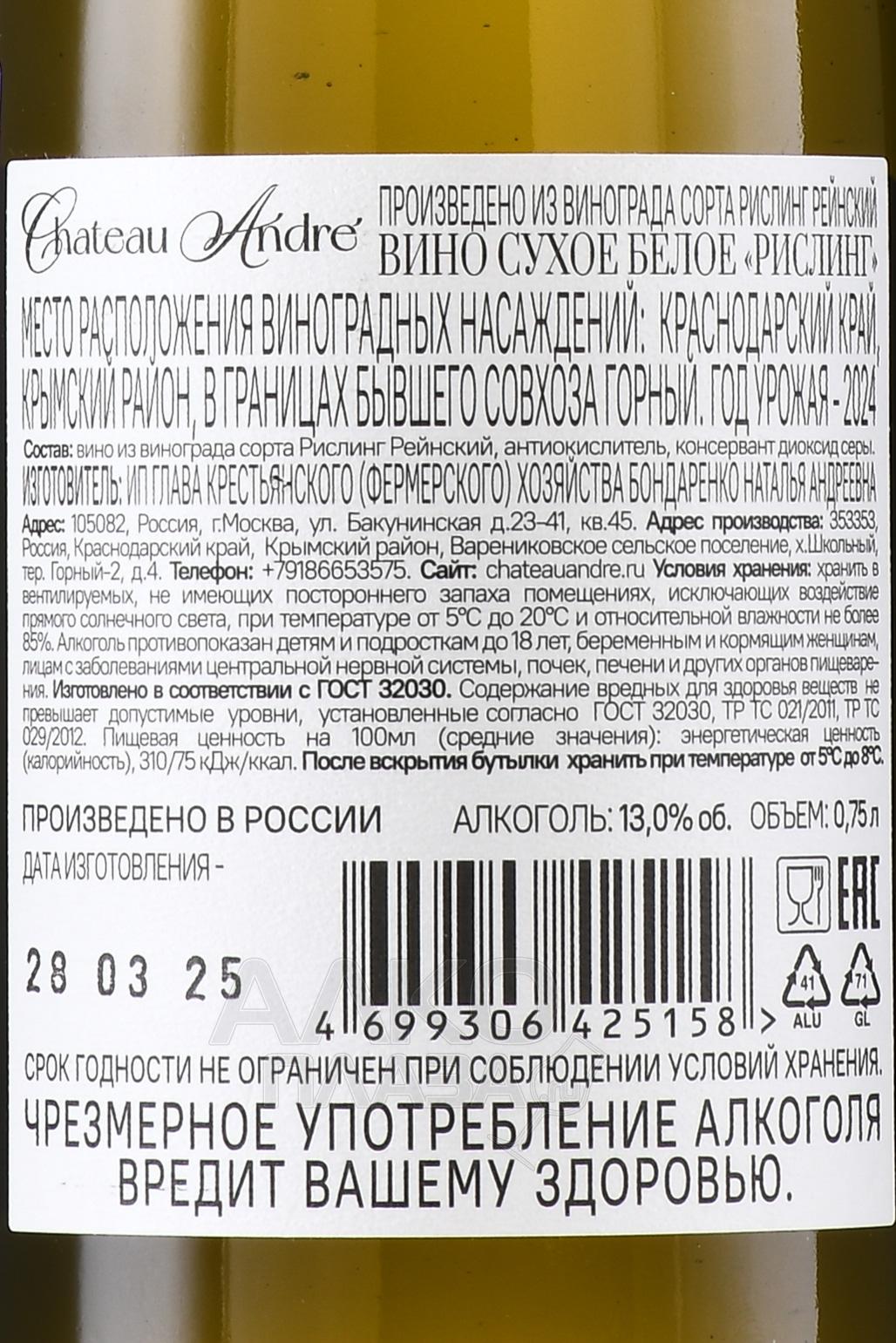 Белое сухое вино Chateau Andre Riesling 0,75 л обладает традиционной для Рислинга выразительной кислотностью, благодаря чему имеет потенциал для длительной выдержки в бутылке — минимум 3-5 лет. Элегантный напиток произведен небольшой партией частной винодельней в Краснодарском крае. Виноград выращивали в Крымском районе на территории бывшего совхоза «Горный». Урожай собирали вручную в утренние часы, чтобы сохранить свежесть ягод. Полученное путем мягкого прессования сусло подвергли медленной ферментации при контролируемой низкой температуре. Брожение проходило в стальных емкостях, что позволило максимально раскрыть сортовые характеристики. Выдержка на тонком осадке в течение нескольких месяцев придала напитку глубину вкуса и тонкую текстуру.