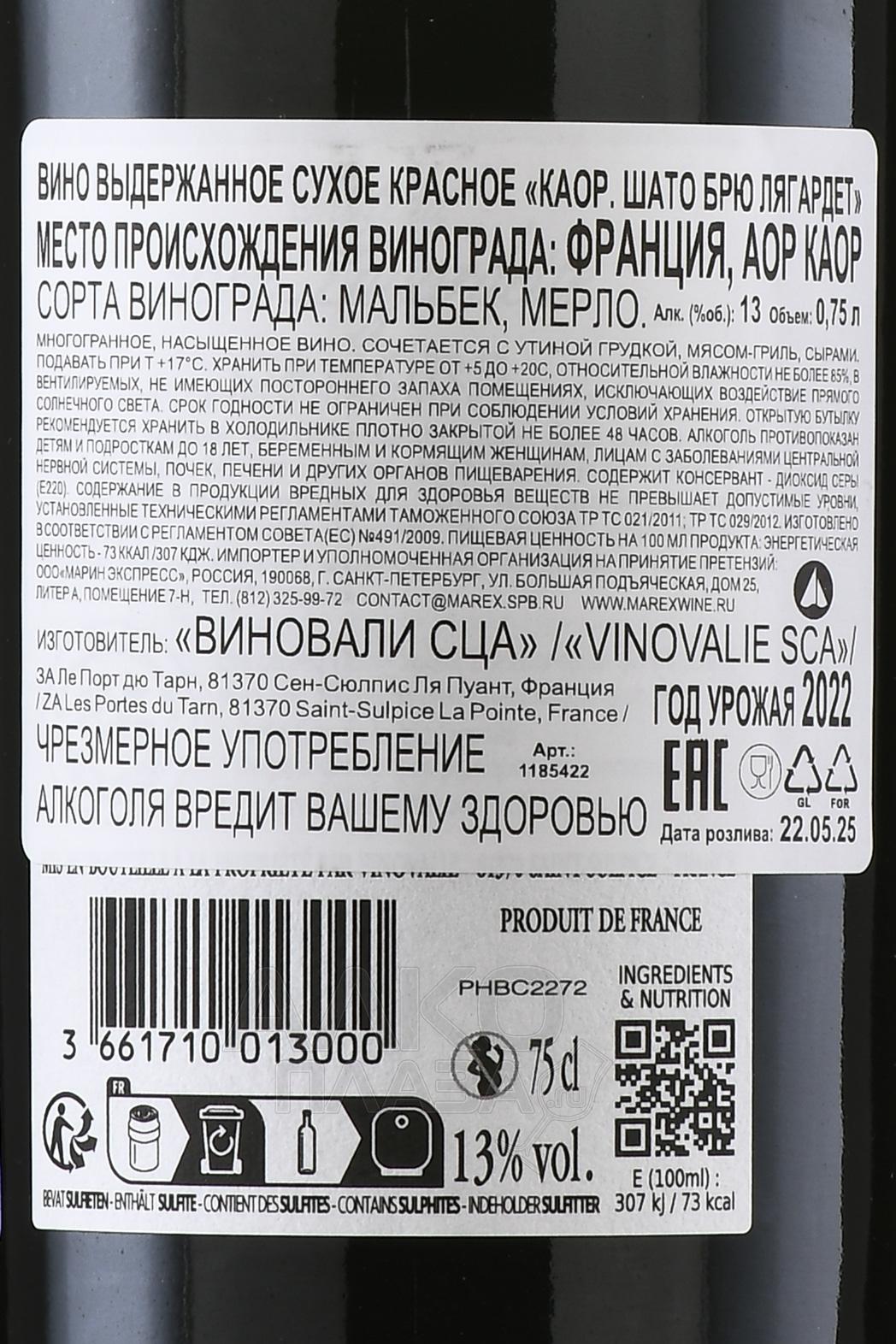 Красное сухое вино Chateau Bru Lagardette 0,75 л производится во Франции, в винодельческом регионе Каор, расположенном на юго-западе страны в долине реки Ло. Этот аппелласьон известен напитками на основе сорта Мальбек и выраженным терруарным характером. Виноградники хозяйства находятся на террасах и плато с известняковыми и глинисто-известковыми почвами, местами с включениями гравия. Такие почвы обеспечивают хороший дренаж и способствуют формированию плотной структуры вина. Климат — умеренно континентальный, с тёплым летом и прохладными ночами, что помогает сохранить кислотность и ароматическую чёткость ягод. Виноград собирают при полной зрелости, ферментация проходит в чанах с контролем температуры. Выдержка осуществляется в дубовых бочках, придавая напитку глубину и подчёркивает сортовой характер без избыточного влияния древесины.