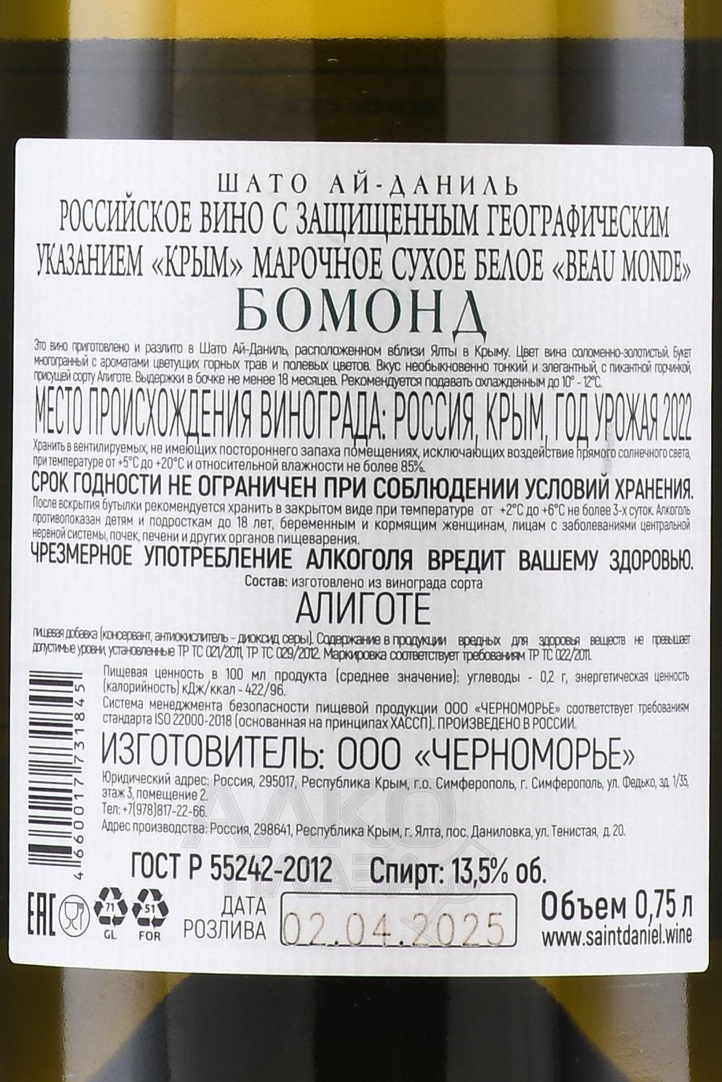 Производство: вино произведено из французского сорта винограда Алиготе. Сбор урожая проходил вручную. Брожение проводили в стальных емкостях при строгом контроле за температурой. Выдерживали вино в дубовых бочках, объёмом 225 л. в течение двух лет