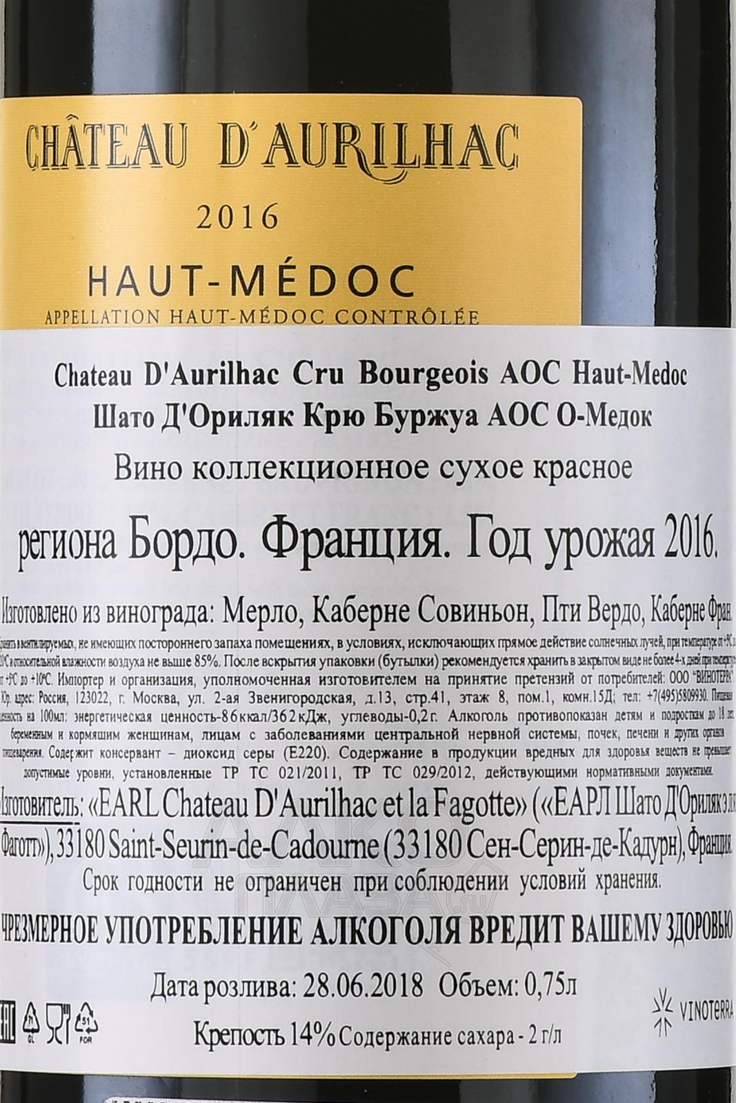 Красное сухое вино Chateau d`Aurilhac Cru Bourgeois Haut-Medoc AOC 2016 г. 0,75 л представлено миллезимной вариацией. Оно купажировано из классических сортов винограда Бордо и произведено на Левом берегу, в крупном апелласьоне О-Медок. В погребе ягоды подвергают традиционной винификации. В завершение напиток выдерживается в дубовых бочках, половина которых ежегодно обновляется.