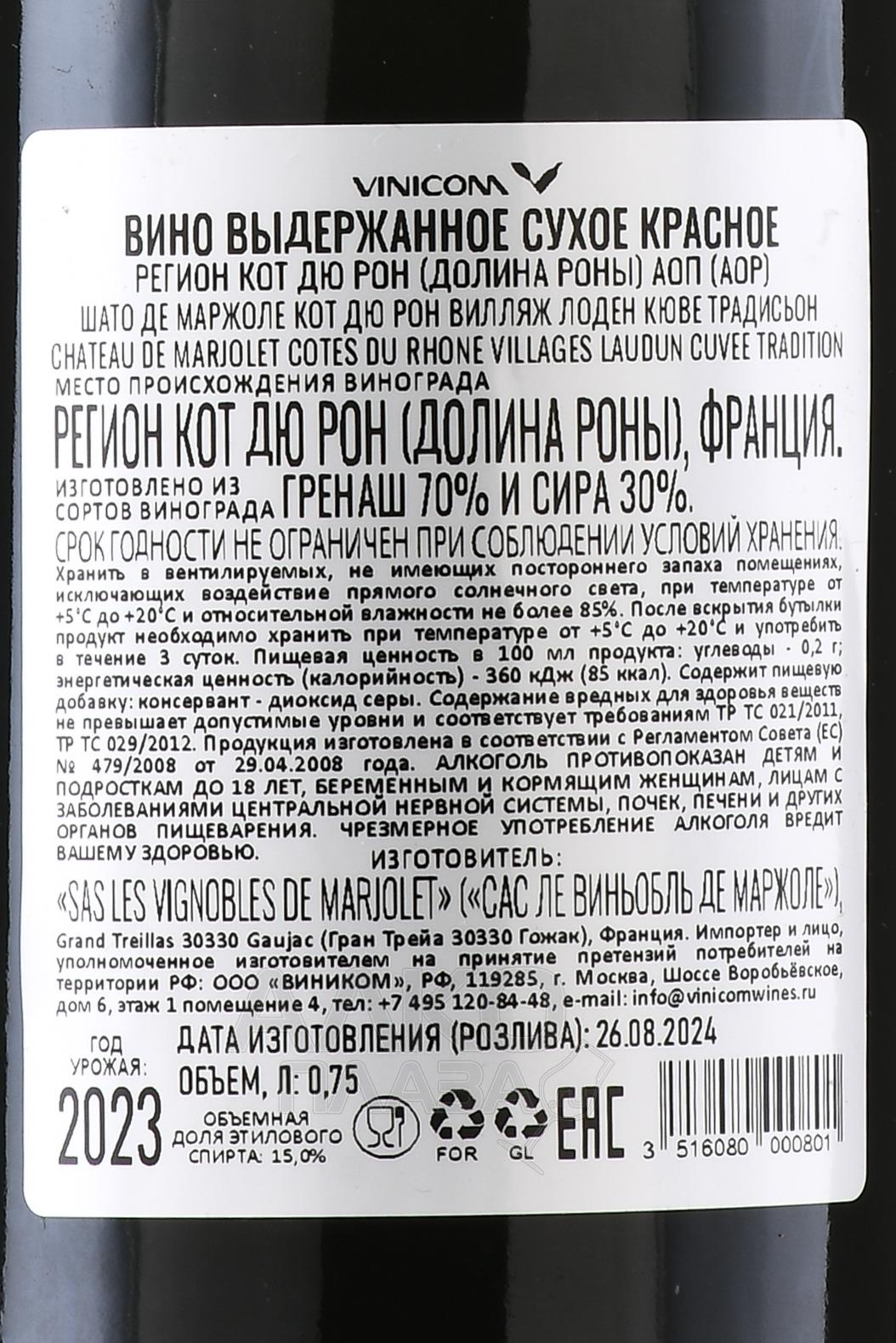 Красное сухое вино Chateau de Marjolet Cotes du Rhone-Villages Laudun Cuvee Tradition 0,75 л создано в классическом стиле региона Долина Роны. Оно гармоничное и насыщенное, отражающее характер терруара Лоден с известняково-глинистыми почвами и теплым солнечным климатом. Виноград сортов Гренаш и Сира был собран с участка площадью 6,5 гектаров, где лозы в среднем старше 25 лет. Ферментация длилась около месяца при контролируемой температуре, что помогло сохранить ароматические вещества и мягкость танинов. После этого вино выдерживалось 12 месяцев в терморегулируемых резервуарах. Результат — сбалансированный, структурный бленд с потенциалом выдержки до 10 лет, отмеченный выразительным фруктовым профилем и элегантной глубиной.