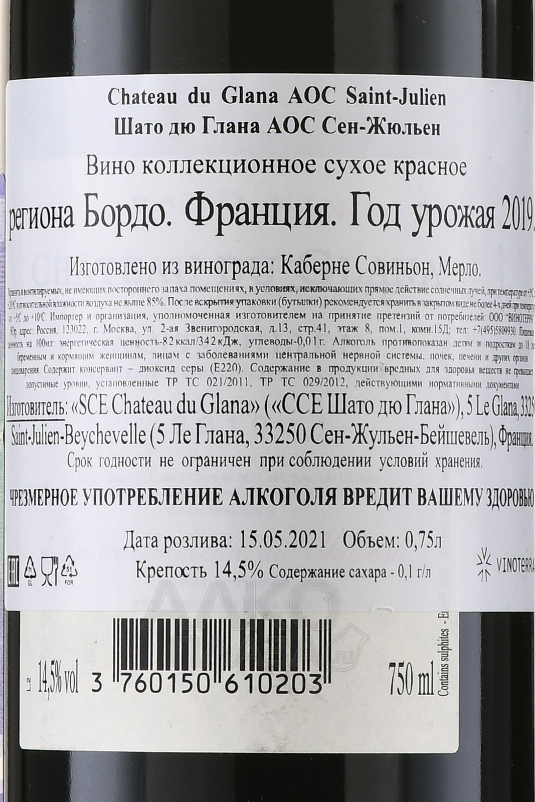 Красное сухое вино Chateau du Glana Saint-Julien AOC 0,75 л производится в винодельческом хозяйстве, расположенном на левом берегу Жиронды в Бордо. Поместье находится рядом с известными классифицированными крю региона. Виноградники размещены на гравийных почвах с хорошим дренажем. Такие участки аккумулируют тепло и способствуют равномерному созреванию ягод. Подобный терруар придаёт структуру и глубину, формирует выразительный характер напитка. Хозяйство создано в 1961 году, когда винодел Анри Мартен приобрёл часть земель соседнего Château Saint-Pierre. Сегодня виноградники занимают несколько десятков гектаров и засажены традиционными бордоскими сортами. Урожай собирают после достижения оптимальной зрелости. Ягоды проходят ферментацию в стальных чанах с контролем температуры. Экстракция проходит мягко, чтобы сохранить баланс танинов и фруктовой выразительности. Затем напиток выдерживают во французских дубовых барриках, часть которых ежегодно обновляется. Созревание длится около года, после чего проводится купажирование и розлив.