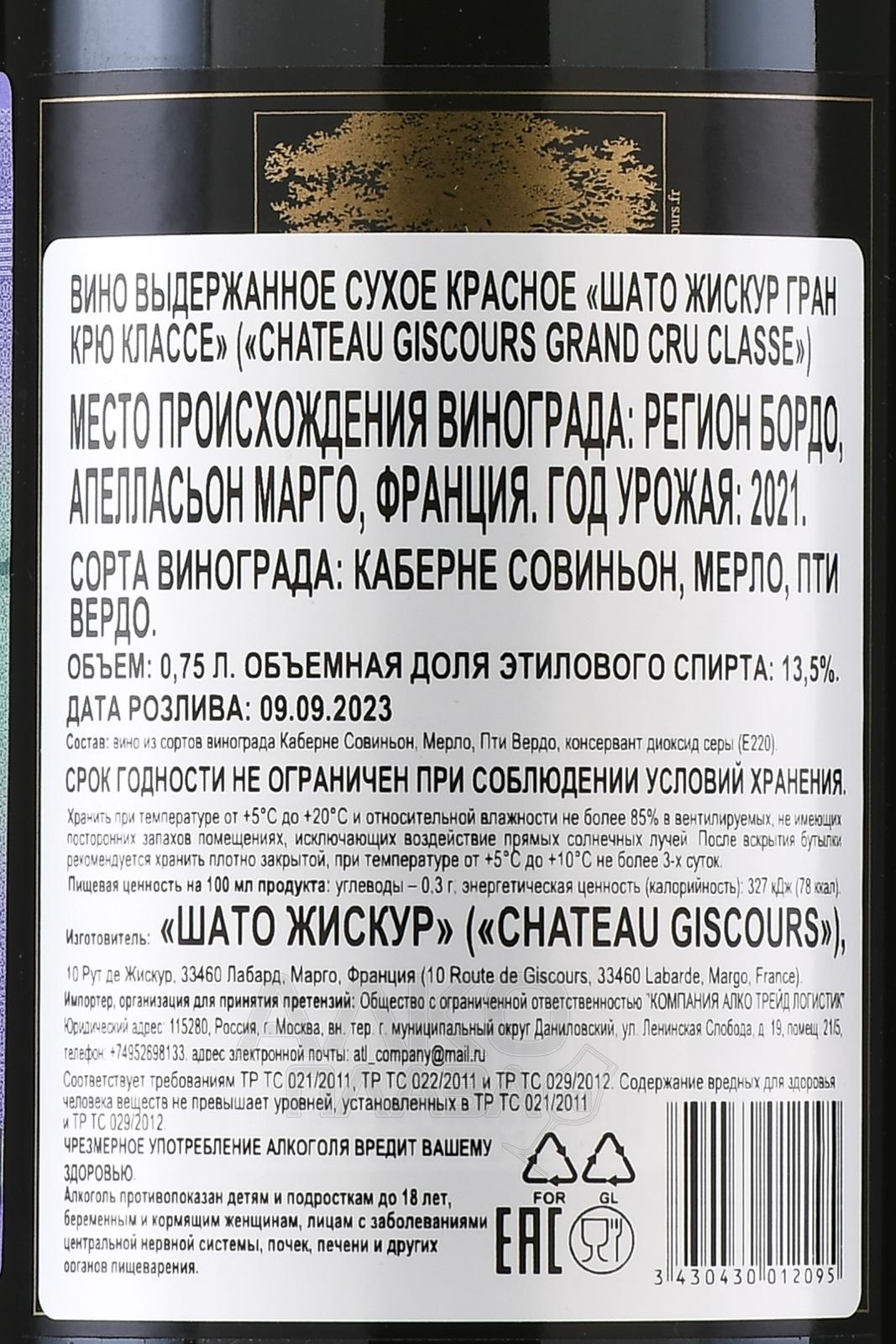 / Chateau Giscours Сайт alcoplaza.ru содержит информацию, не рекомендованную для лиц, которые не достигли возраста 18 лет. Чтобы осуществить вход на сайт, Вам необходимо подтвердить свой совершеннолетний возраст. Сведения, размещенные на сайте , не являются рекламой, носят исключительно информационный характер, и предназначены только для личного использования. Информация на сайте не является публичной офертой.