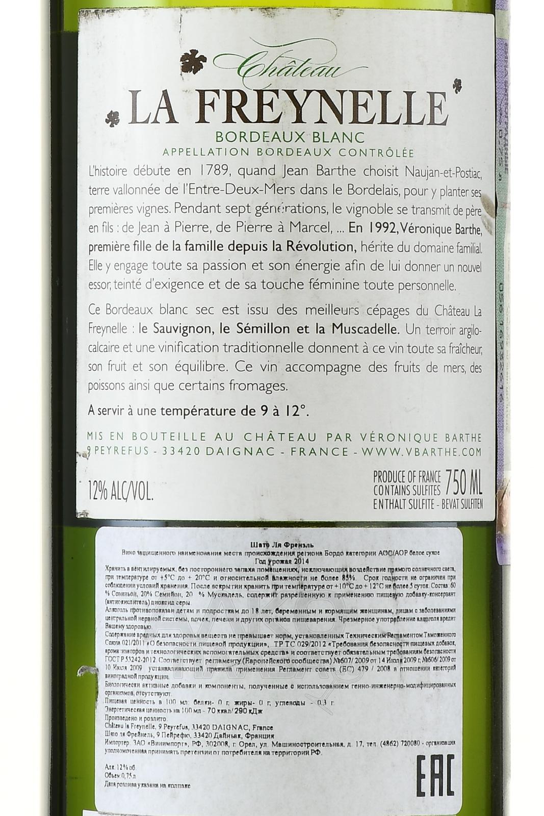Белое сухое вино Chateau La Freynelle Blanc Bordeaux AOC 0,75 л содержит три сорта винограда с избранных участков знаменитого французского региона Бордо. Их сбор проводился в центральной части винодельческой местности Антр-де-Мер с классическими почвами и немного прохладным климатом. Сырье отсортировали вручную и подвергли предферментационной щадящей обработке. Во время сбраживания в стальных баках поддерживался определенный температурный режим. У вина небольшой потенциал хранения (порядка трех лет), поэтому рекомендуется дегустировать его в молодом виде.
