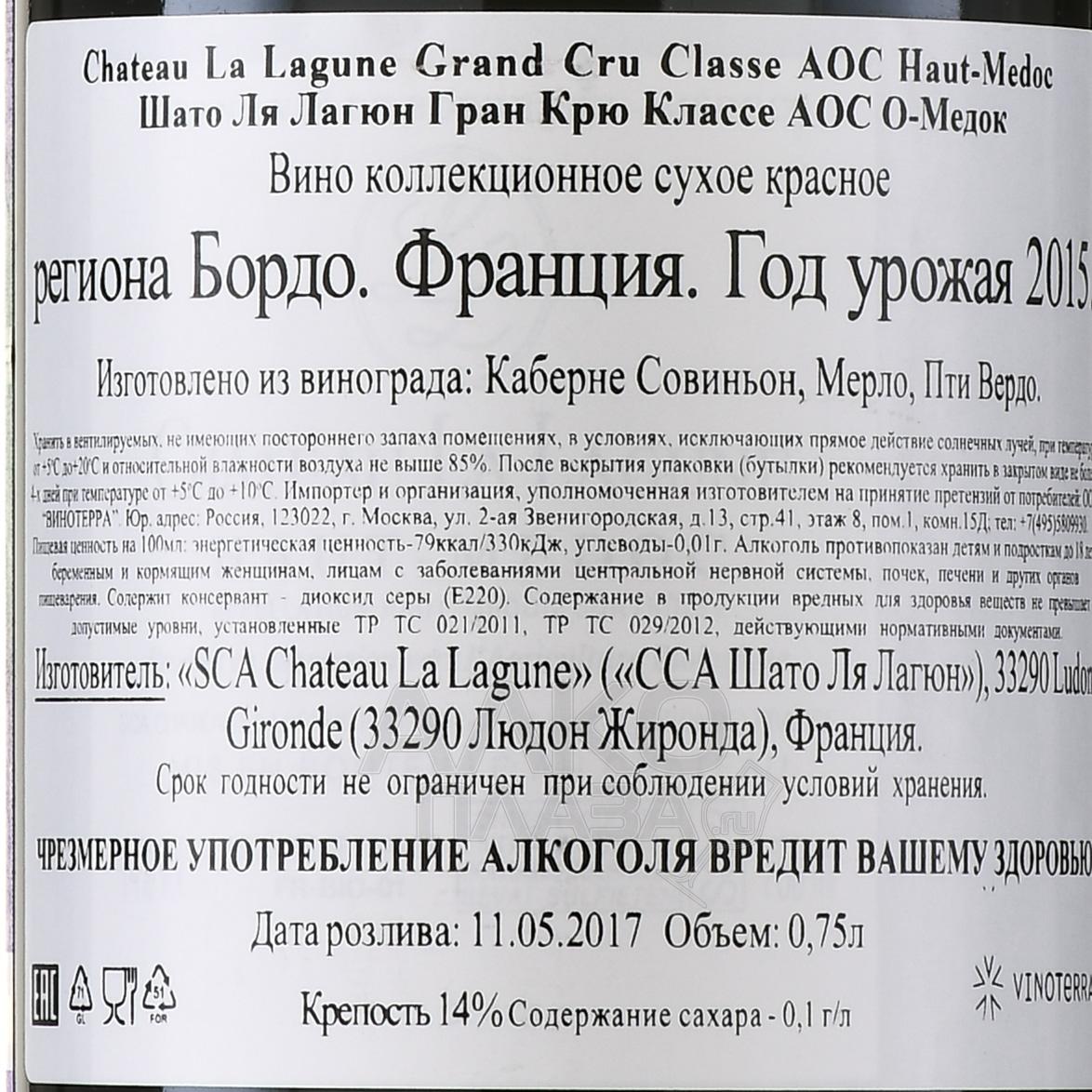 Красное сухое вино Chateau La Lagune Grand Cru Classe Haut-Medoc 0,75 л создано в одном из старейших хозяйств региона Медок, основанном в XVIII веке. Виноградники занимают около 80 гектаров и расположены на террасах с гравийными почвами, которые обеспечивают хороший дренаж и насыщение лоз теплом. Такое сочетание позволяет ягодам достигать высокой концентрации вкуса и аромата. Винодельня сертифицирована как органическая и биодинамическая, что подтверждает особое внимание к экологичности и качеству. На завершающей стадии производства напиток выдерживается в дубовых бочках, часть из которых новые, что придает ему сложность и потенциал к длительному хранению.