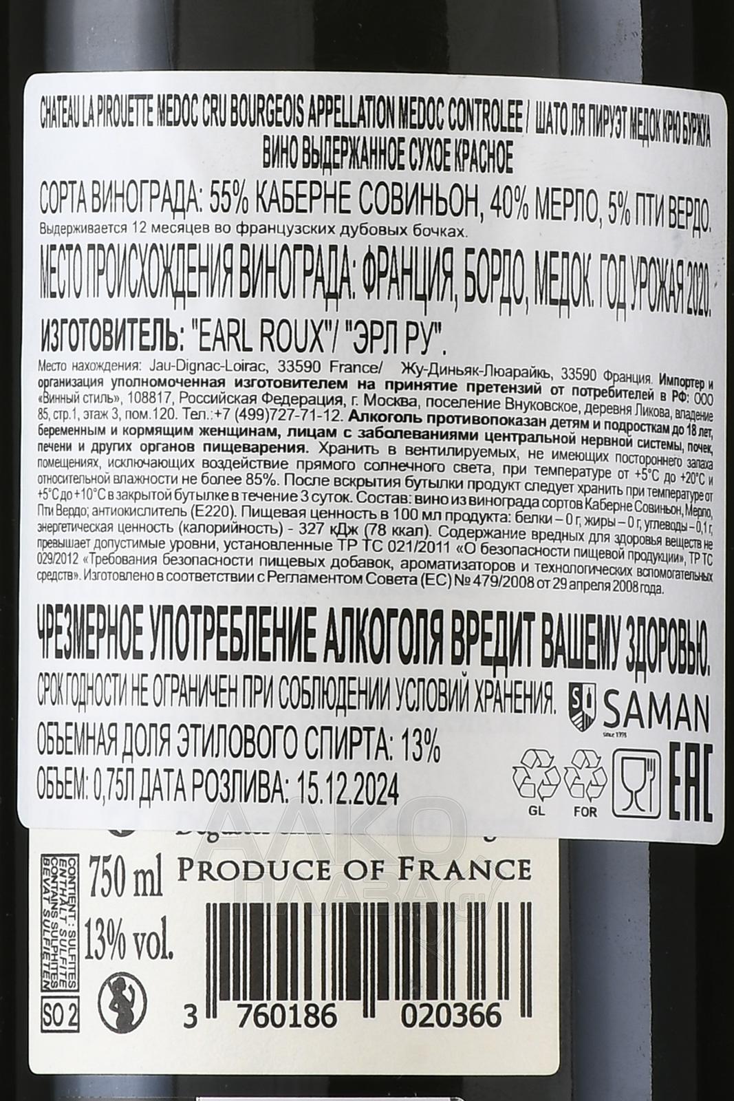 Chateau La Pirouette Medoc Cru Bourgeois - вино Шато ля Пируэт Медок Крю Буржуа 0.75 л красное сухое