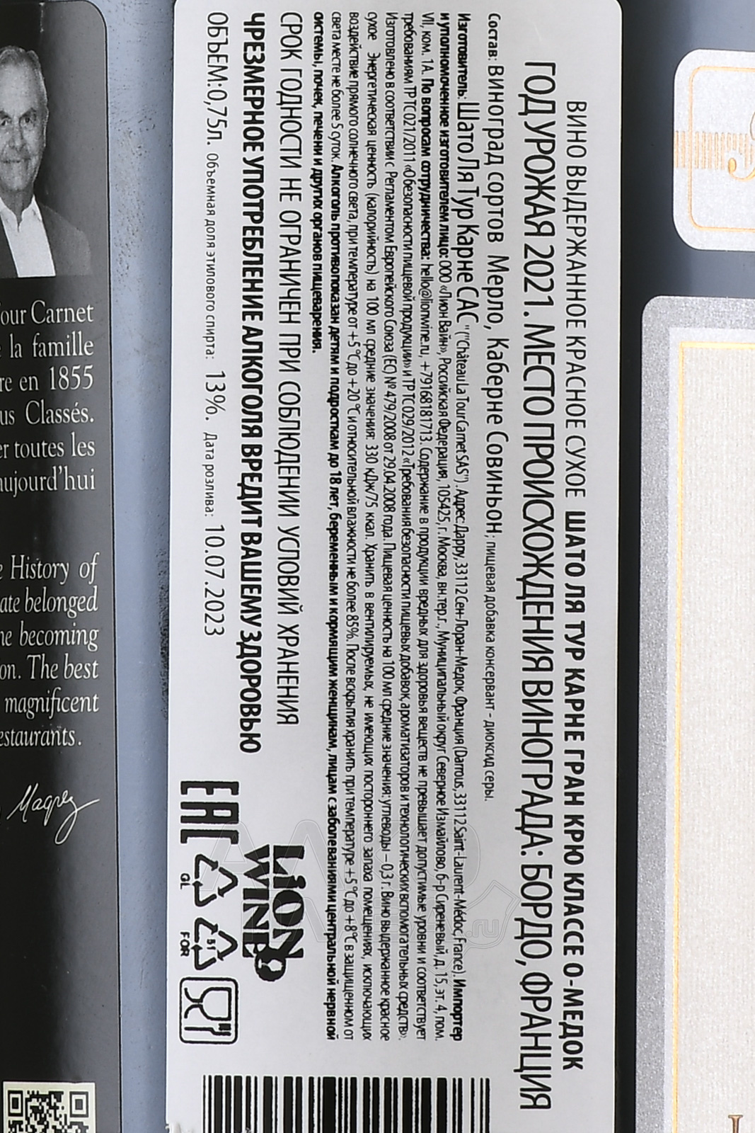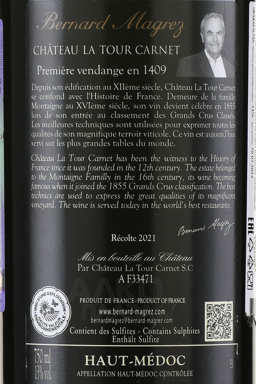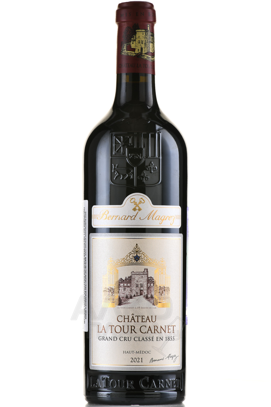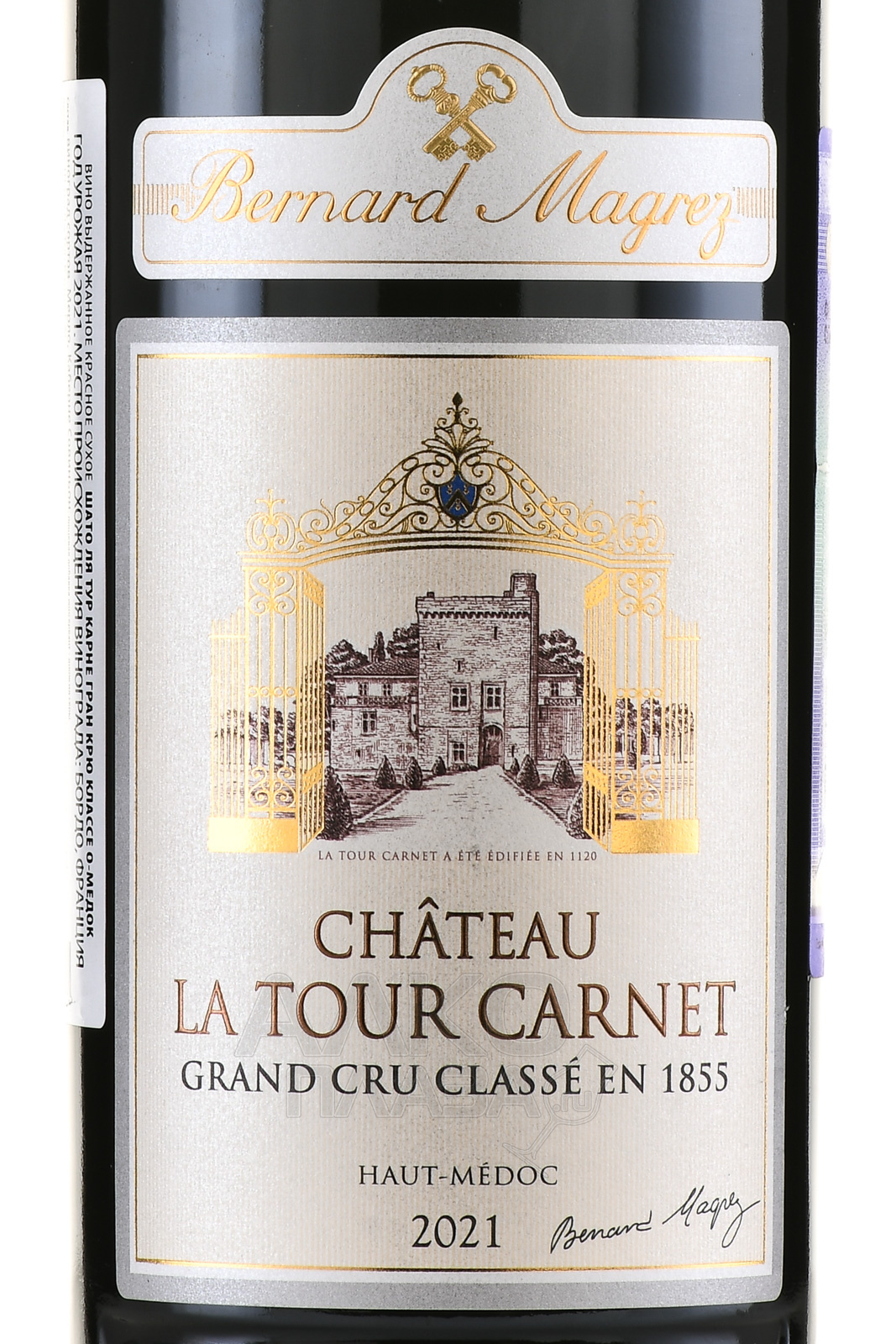 Красное сухое вино Chateau La Tour Carnet Grand Cru Classe Haut-Medoc AOC 2021 г. 0,75 л содержит виноград нескольких вариаций, выращенный на плантациях престижной категории из глинистых и гравийных пород, которые принадлежат влиятельному французскому виноделу Бернару Магре. На этих участках поддерживается определенный уровень плотности посадки, не превышающий 10 тысяч лоз на один гектар. Урожай ручного сбора подвергся гребнеотделению и сортировке с последующими процедурами сбраживания в стальных баках и 18-месячной выдержки в новых дубовых барриках. Все стадии протекали при строгом термоконтроле.