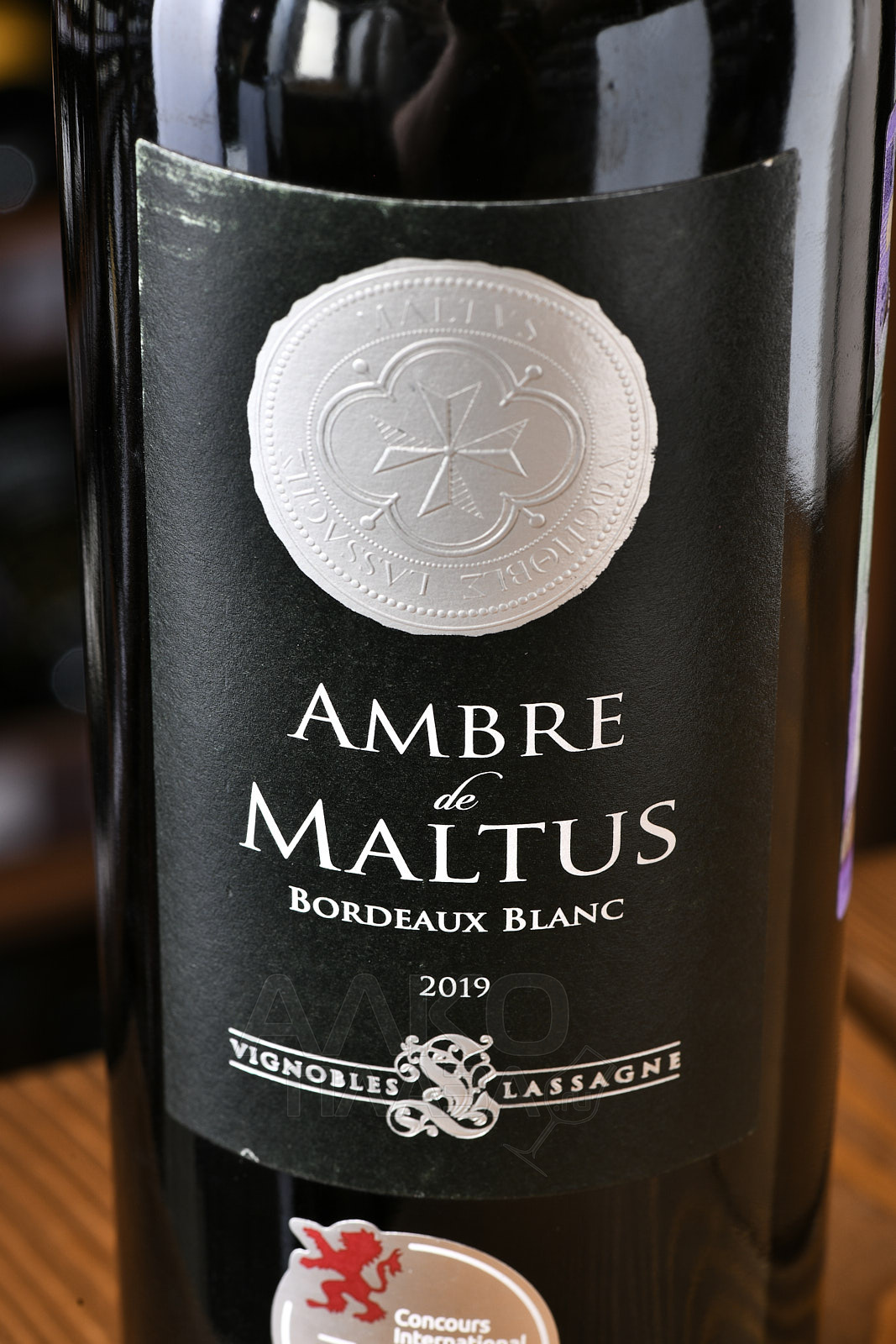 Белое сухое вино Chateau Maltus Ambre de Maltus 2019 год 0,75 л выпущено виноделами по фамилии Лассан на предприятии, функционирующем в соответствии с бережными методами обработки ягод. Виноград для производства напитка был собран в знаменитом регионе Bordeaux, где также выполнялись процессы создания спиртного: ферментация в новых дубовых барриках и базовая выдержка на дрожжевом осадке в похожей таре. Дополнительное вызревание вина заняло до восьми месяцев.
