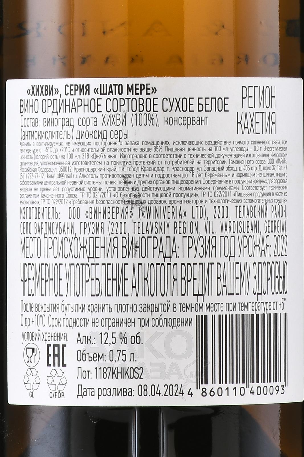 Белое сухое вино Chateau Mere Khikhvi 0.75 л — моносортовой напиток грузинского происхождения, изготовленный из автохтона Хихви одного года сбора. Для изготовления вина крепостью 13% собирают плоды возрастом более 25 лет. Винификация проходит европейским методом на итальянском оборудовании.