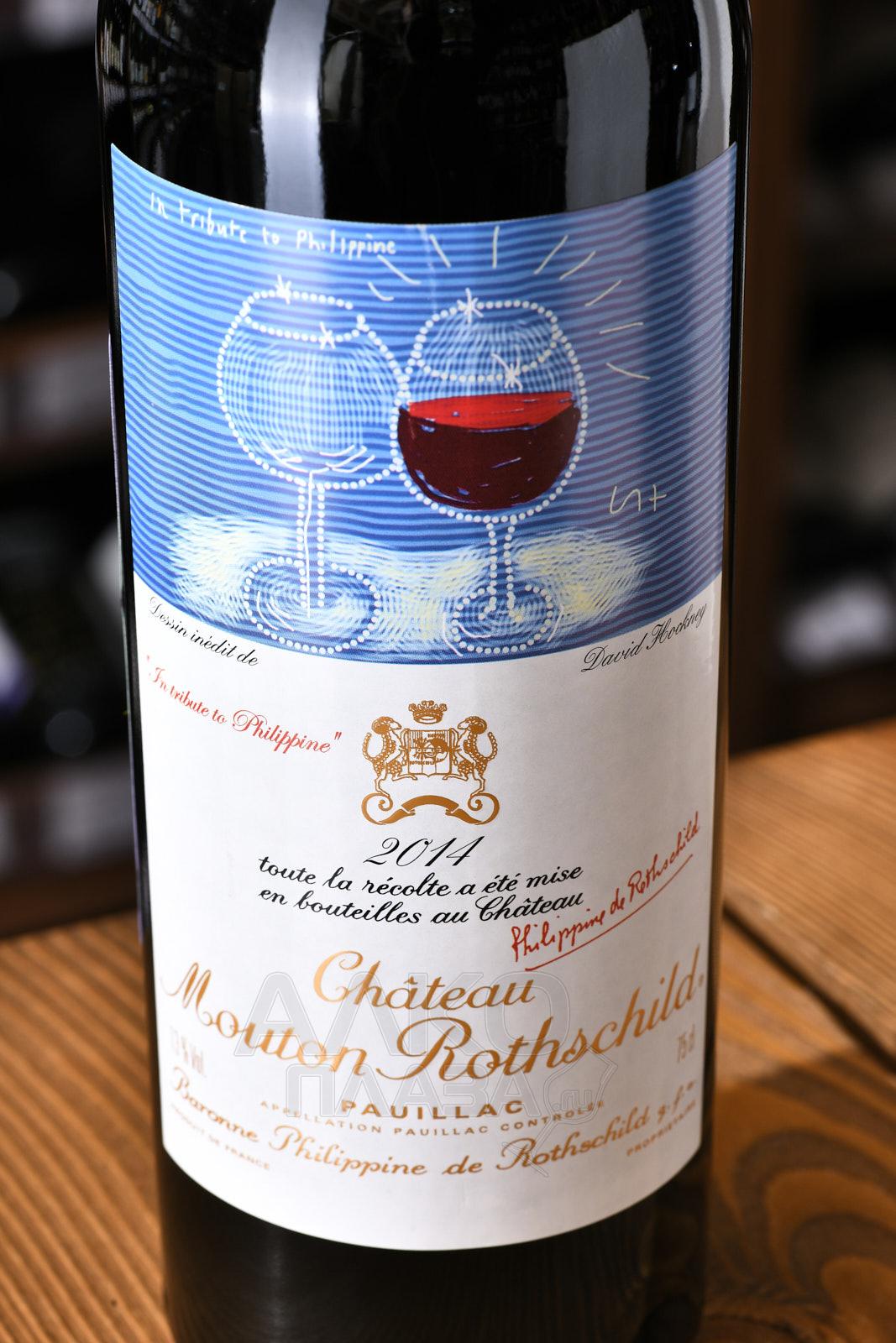 Красное сухое вино Chateau Mouton Rothschild 1er Grand Cru Classe Paulliac AOC 2014 г. поставляется культовым французским хозяйством, использовавшим для его создания отборный виноград с плантаций категории Прьемьер Крю в местечке Пойяк (Бордо). 13-процентный винтаж состоит из ягод трех сортов, собранных с сентября по октябрь 2014 г. и прошедших этапы мацерации, ферментации и выдержки в дубовых барриках. На этикетке этой вариации изображена работа художника Дэвида Хокнея — друга баронессы де Ротшильд.