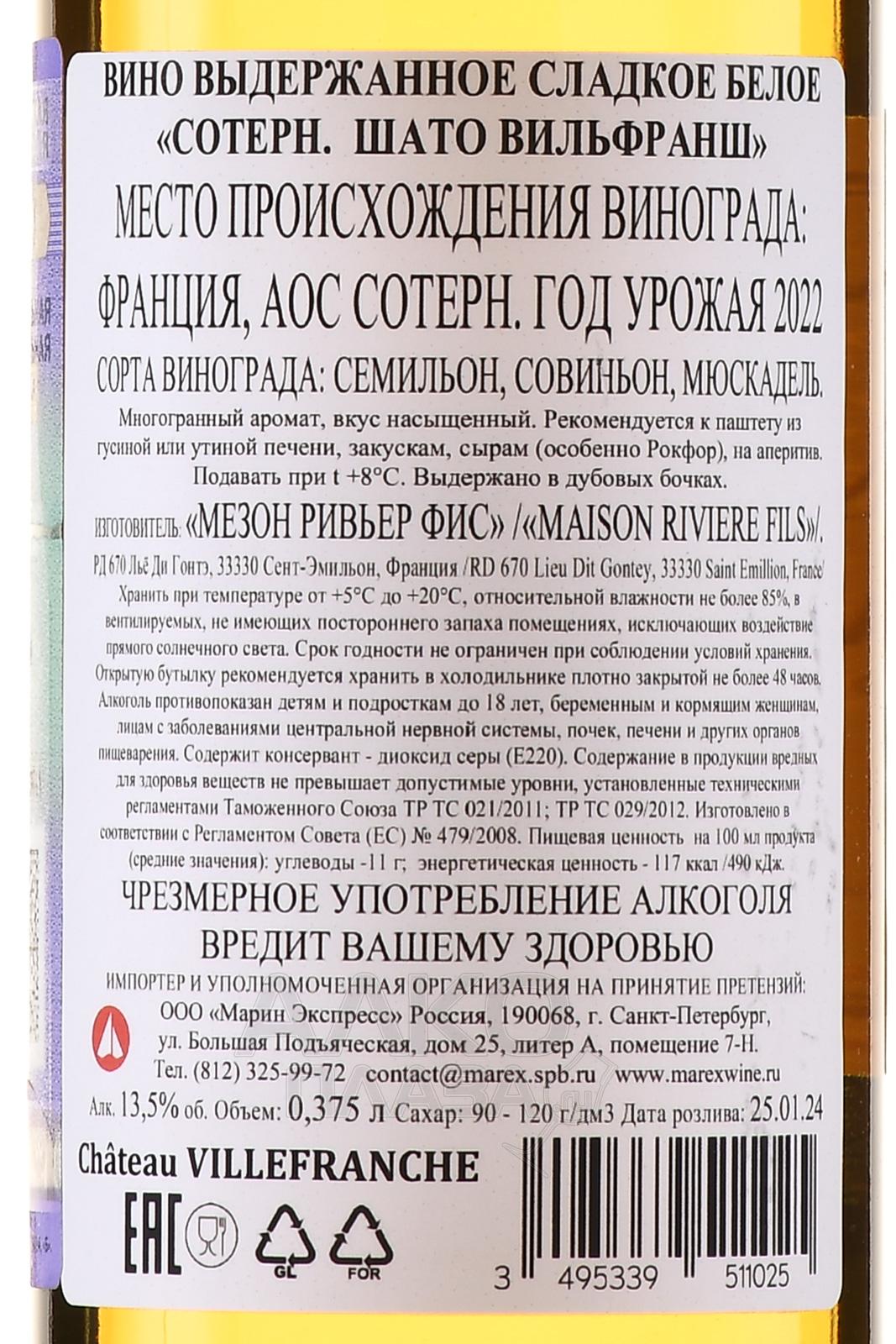 Chateau Villefranche Sauternes - вино Сотерн Шато Вильфранш 0.375 л белое сладкое