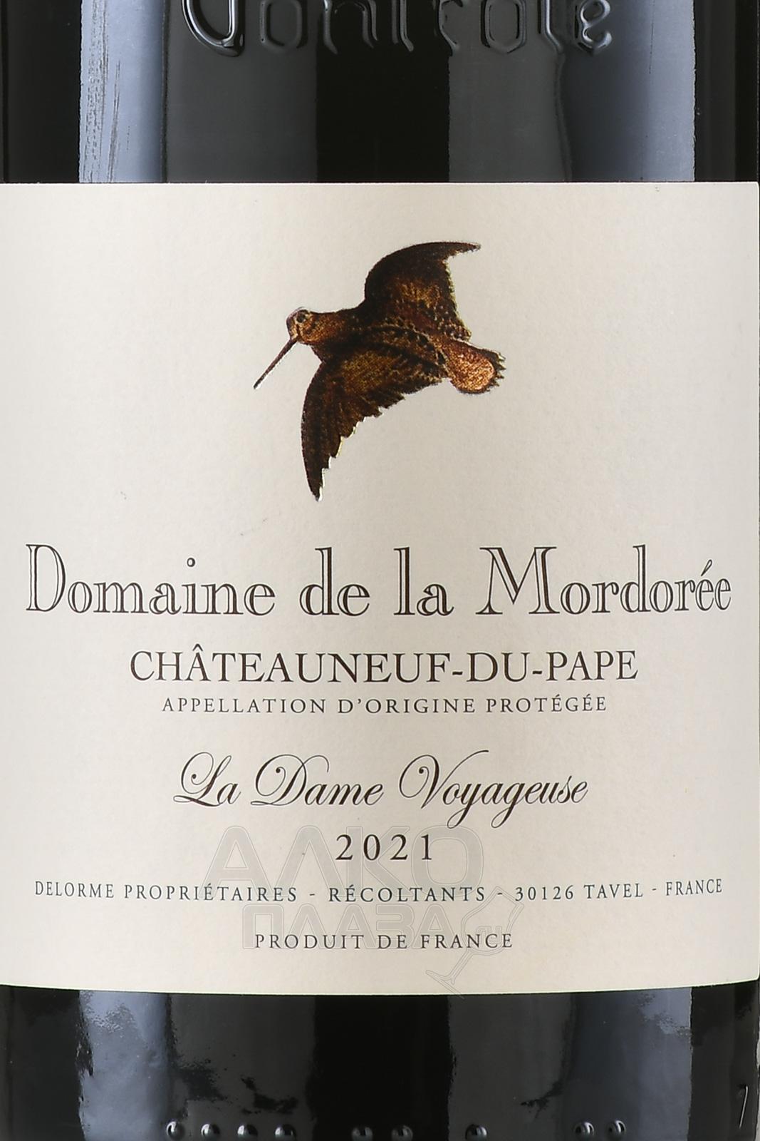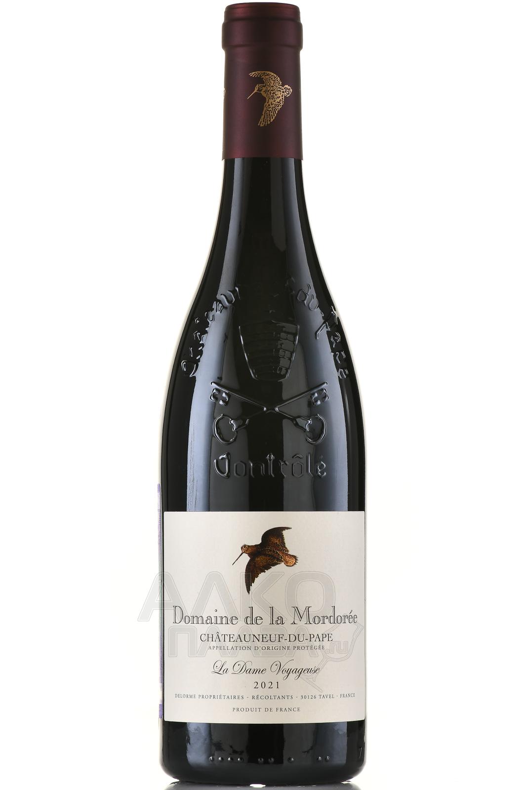 Красное сухое вино Chateauneuf-du-Pape La Dame Voyageuse 0,75 л — более доступная и элегантная версия вина La Reine des Bois от Domaine de la Mordorée. Напиток производится в престижном французском апелласьоне Шатонёф-дю-Пап, в регионе с характерными каменисто-галечными почвами плато Ла Кро (La Crau). Возраст виноградных лоз достигает примерно 60 лет. Урожай собирают вручную, виноград ферментируется около 30 дней при контролируемой температуре до 34 °C. Средняя урожайность виноградников — 30 гектолитров на гектар. В состав ассамбляжа входит около 90% Grenache, по 4% Mourvèdre и Syrah, а также 1–2% сортов Counoise и Vaccarese. При выращивании применяются органические и биодинамические методы. Выдержка проходит в бочках из дуба и резервуарах из нержавеющей стали.
