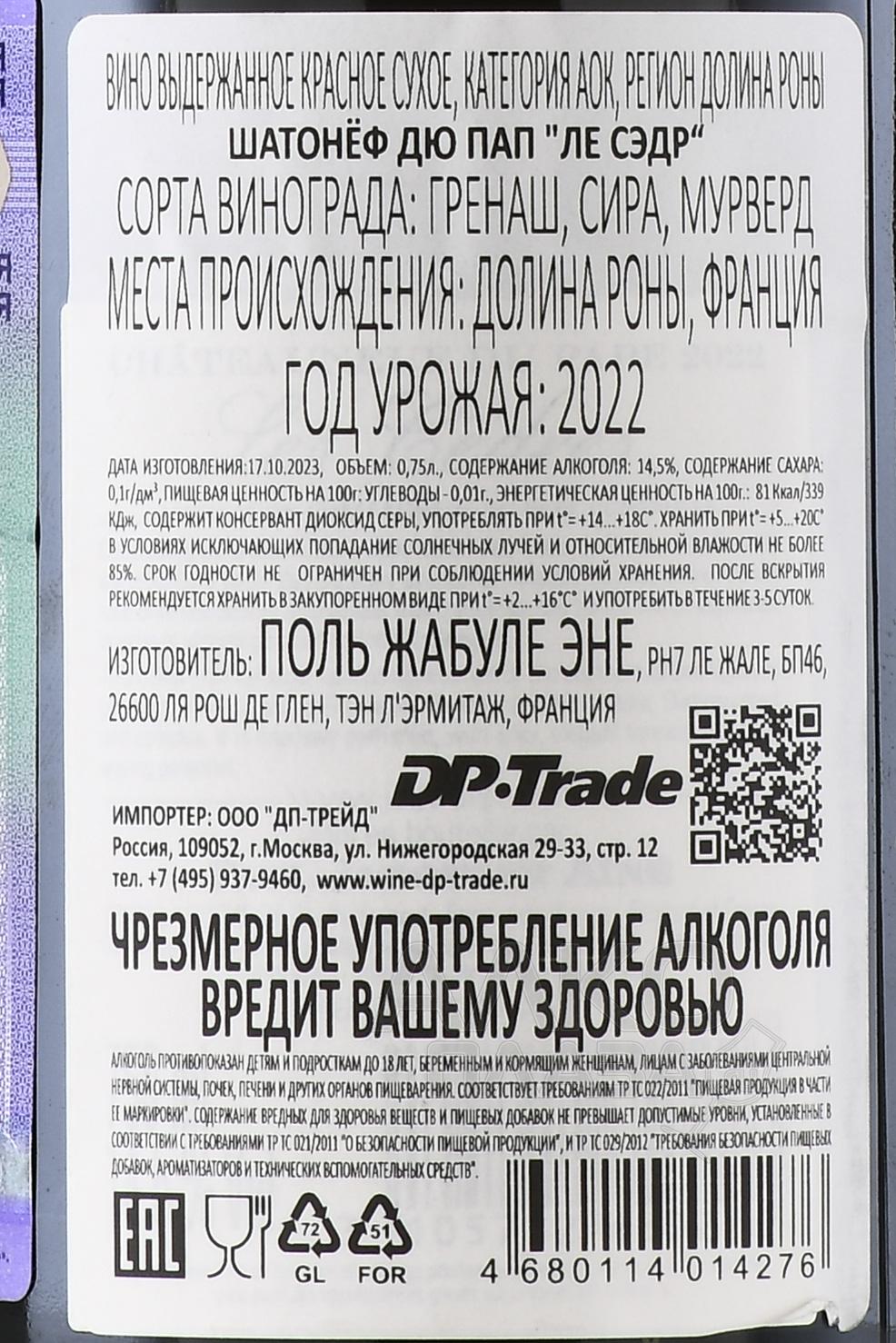 Красное сухое вино Chateauneuf du Pape Les Cedres 0,75 л произведено в легендарном регионе Долины Роны во Франции, где виноделие имеет многовековую историю. Купаж создан на основе традиционных сортов, выращенных на галечных почвах, которые аккумулируют тепло и способствуют равномерному созреванию ягод. Урожай собрали вручную с внимательной сортировкой. Ферментация проходила в бетонных и стальных объемных чанах. Для выдержки использовали большие бочки из дубовой древесины, где вино провело как минимум один год. Потенциал его хранения оценивается экспертами в десять-двадцать лет.
