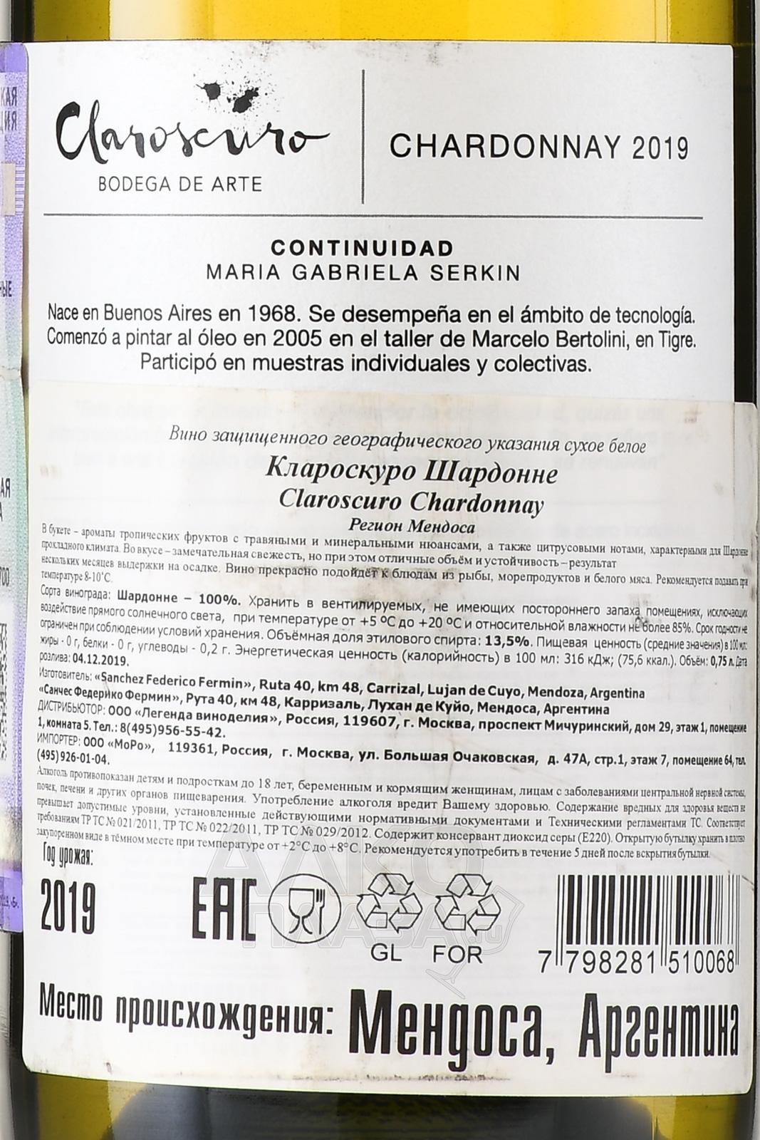 Claroscuro Chardonnay Mendoza 0,75 л – белое сухое вино из аргентинского винограда, выращенного на большой высоте. Урожай собирают на участках Долины Уко в провинции Мендоса. Ягоды слегка прессуют, а отжатый сок сливают в ферментационные чаны, где сбраживают при температуре 15 °С. Напиток проходит алкогольную и малолактическую ферментацию, после чего 95% спиртного выдерживается в стальных резервуарах, а 5% – в дубовых бочках второго наполнения. Этикетка бутылки оформлена в художественном стиле.