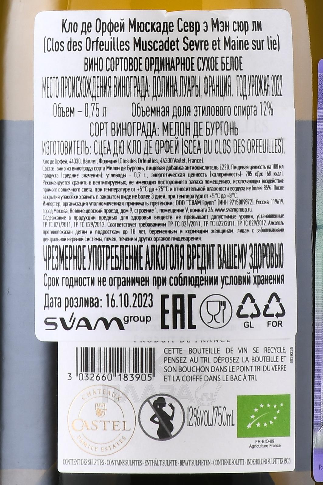 Белое сухое вино Clos des Orfeuilles Muscadet Sèvre-et-Maine Sur Lie 0,75 л производится на западе Франции, в долине Луары. Виноградники расположены вблизи слияния рек Севр-Нантез и Мен, на древних магматических и метаморфических почвах, представленных гнейсом, гранитом и сланцем. Эти породы обеспечивают хороший дренаж и придают напиткам выраженную минеральность. Атлантический климат с мягкими зимами и прохладным летом способствует медленному созреванию ягод и сохранению высокой естественной кислотности. Образец изготавливается традиционным для региона способом sur lie — после ферментации сусло выдерживается на тонком осадке без перелива в течение нескольких месяцев, что подтверждено правилами апелласьона. Этот метод усиливает текстуру, добавляет объём и подчёркивает свежесть без влияния дуба.