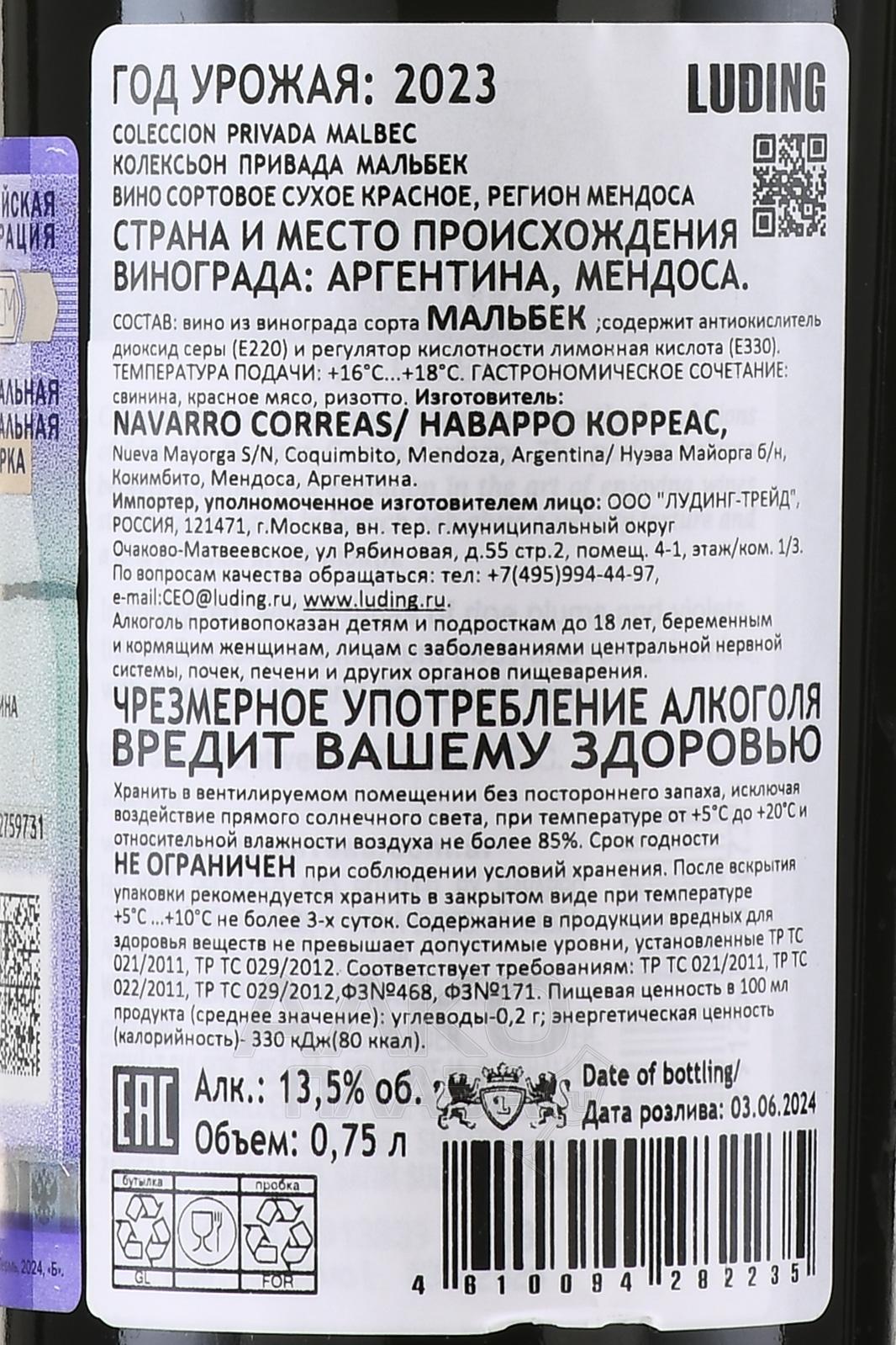Красное сухое вино Coleccion Privada Malbec 0,75 л в п/у произведено из винограда флагманского местного сорта, плоды которого собрали в аргентинском регионе Мендоса, преимущественно в долине Уко. Терруар находится на высоте 800–1200 м над уровнем моря и отличается жарким солнцем, сухим климатом и резкими суточными перепадами температур. Днем воздух прогревается до +30 °C, а ночью – охлаждается до +10 °C. Такие условия способствуют накоплению сахаров и яркому выражению сортовых особенностей. В год сбора урожая количество осадков было минимальным, что помогло получить ягоды высокого качества без болезней и грибков. Выдержка ферментированного вместе с мезгой сока длилась несколько месяцев в дубовых бочках (80% французских и 20% американских), что дополнило фруктовый характер напитка мягкими пряными тонами ванили и табака.
