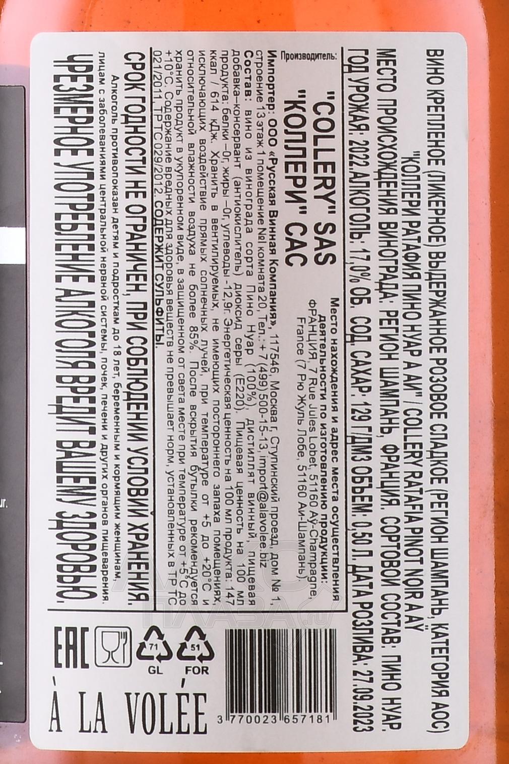 Розовое сладкое вино Collery Ratafia Pinot Noir a Ay 0,5 л в п/у производится в коммуне Аи в самом сердце региона Шампань. Этот напиток создается хозяйством с вековыми традициями, основанным в 1893 году. Он представляет собой уникальный стиль: это крепленое вино, изготовленное из свежего сока винограда, к которому добавляют виноградный спирт, чтобы остановить брожение и сохранить естественную сладость. Для этой версии используется красный виноград, выращенный на холмах Аи, в терруаре категории Grand Cru. Почвы здесь состоят из известняка и мела, что придает купажу особую минеральность и чистоту вкуса. Выдержка проходит в дубовых бочках, где образец набирает сложность, мягкость и глубокие фруктовые тона.