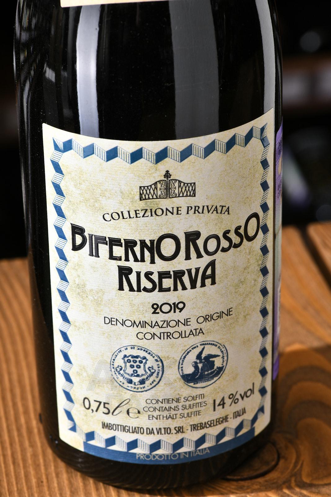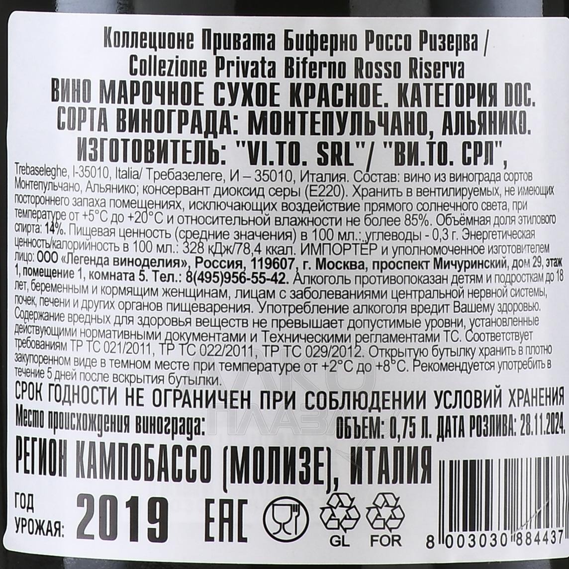 Красное сухое вино Collezione Privata Biferno Riserva Rosso 0,75 л производится из 2 сортов винограда, ягоды которых собираются в Молизе. Урожай, собранный на этапе максимальной спелости, отжимают, далее происходит винификация при соблюдении температурного режима с последующей декантацией. Процесс старения занимает 36 месяцев и проходит частично в стальных чанах и частично дубовых бочках.