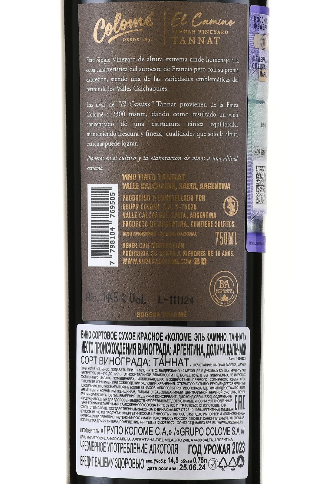 Красное сухое вино Colome El Camino Tannat 0,75 л производится в аргентинской провинции Сальта, в долине Кальчаки. Винодельня работает в одном из самых высокогорных винодельческих районов мира. Виноградники, дающие урожай для линейки Эль Камино, расположены на высоте 2300 метров над уровнем моря. Здесь преобладают каменистые и песчано-аллювиальные почвы с низким содержанием органики. Они ограничивают урожайность и способствуют концентрации веществ в ягодах. Климат — сухой, с интенсивным солнечным излучением и резкими перепадами дневных и ночных температур. Эти условия формируют плотную структуру напитка и сохраняют природную кислотность. Винификацию ведут из собранного вручную винограда. После брожения сусло отдыхает 12 месяцев во французских барриках объёмом 225и 500 литров (используются ёмкости первого и четвёртого наполнения), а затем проводится финишная отделка в течение полугода в бутылках.
