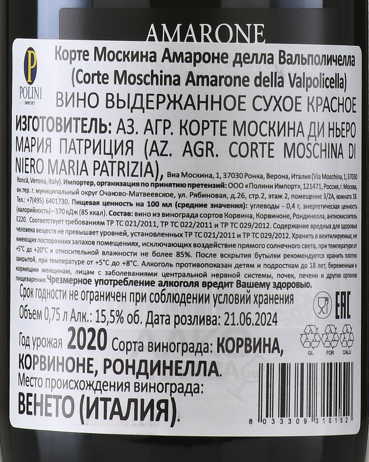 Вино Corte Moschina Amarone della Valpolicella 0.75 л отличается насыщенным характером и благородной глубиной вкуса. Для его создания использовался традиционный метод appassimento: собранные гроздья подсушивались на бамбуковых решётках в течение нескольких месяцев, теряя влагу и концентрируя сахар, что придавало напитку силу и бархатистую плотность. Терруар виноградников находился в сердце области Вальполичелла, где известняково-базальтовые почвы и мягкий климат с перепадами дневных и ночных температур формировали идеальные условия для вызревания сортов. Медленное брожение и длительная выдержка в дубовых бочках завершали технологию создания, позволяя напитку обрести гармонию между мощью и изысканностью.