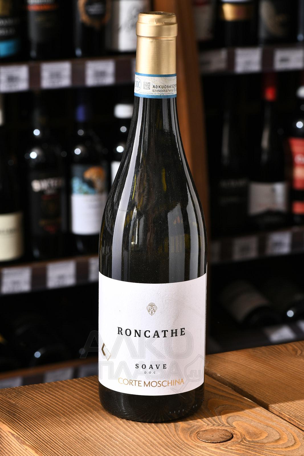 Белое сухое вино Corte Moschina Roncathe Soave DOC 0,75 л происходит из итальянской винодельческой зоны Colline di Ronca в провинции Соаве региона Венето. Плоды собирают в конце сентября с лоз, растущих на вулканических почвах с базальтовым основанием. На винодельне ягоды мягко прессуют и отжимают из них сок, который затем ферментируют в чанах из нержавеющей стали при 13-15 °С в течение 15-18 дней.