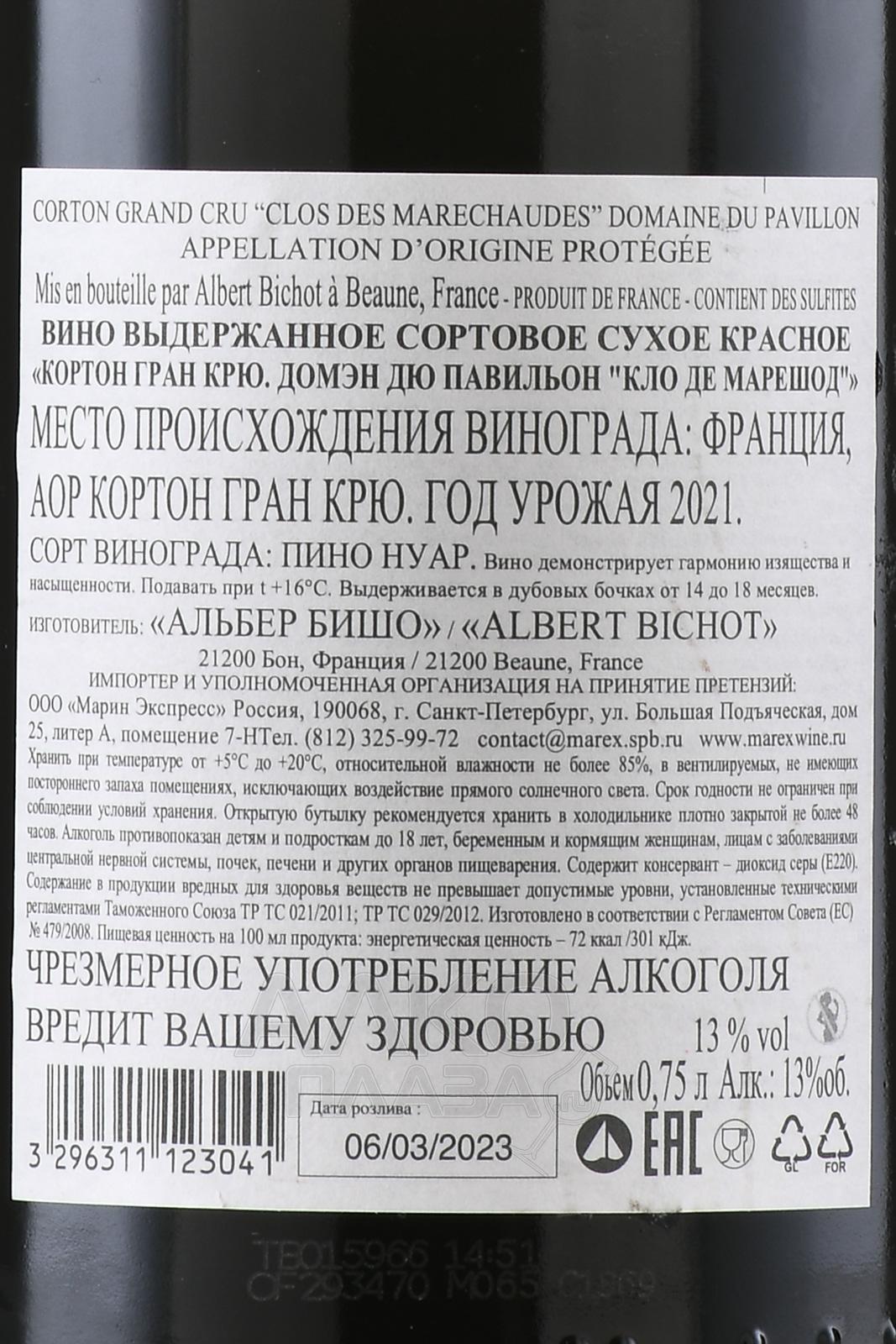 Красное сухое вино Corton Grand Cru Domaine du Pavillon Clos des Marechaudes 0,75 л создано в одном из самых известных терруаров Бургундии. Виноградники расположены на южных склонах холма Кортон, где известковые и глинистые почвы формируют характер вина. Урожай собирают вручную, ягоды проходят сортировку и мягкое прессование. Ферментация протекает в открытых чанах с регулярным перемешиванием. Выдержка осуществляется в бочках из французского дуба (14-18 месяцев), что придает вину глубину и сложность. Кортон Гран Крю Домэн дю Павильон отмечено за сбалансированный стиль и элегантность (94/100 Wine Spectator, 94/100 Tim Atkin, 16,5/20 Jancis Robinson). Оно входит в категорию вин, которые способны развиваться в бутылке десятилетиями, что делает его ценным для коллекционеров.