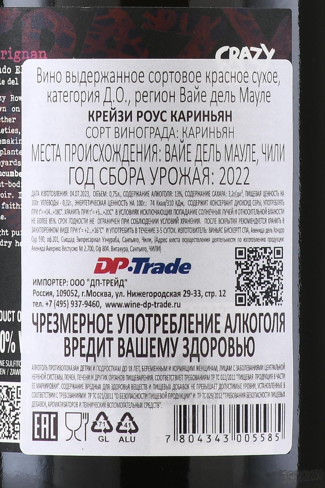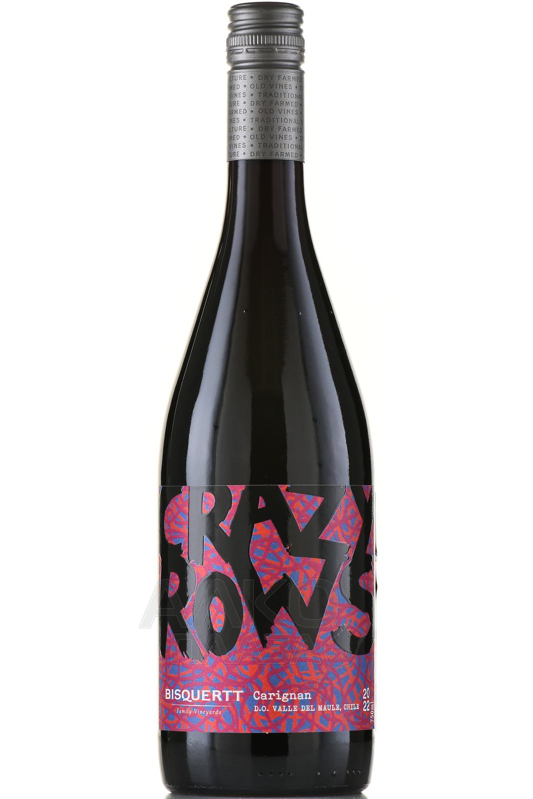 Красное сухое вино Bisquertt Crazy Rows Carignan 0,75 л — выразительное, созданное из сорта Кариньян со старых лоз, высаженных в хаотичных «безумных рядах», которые дали название линейке. Виноградники расположены в долине Мауле, в засушливом прибрежном районе Каукенес, на гранитно-песчаных почвах, богатых кварцем. Год урожая Виноград собирали вручную в небольшие ящики, чтобы избежать повреждения ягод. После мягкого прессования сусло проходило ферментацию в стальных резервуарах при контролируемой температуре около 15 °C, а затем вино выдерживалось шесть месяцев на тонком осадке для повышения глубины и округлости вкуса. Проект Крейзи Роус объединяет виноделов, стремящихся сохранить традиционные сорта Чили.