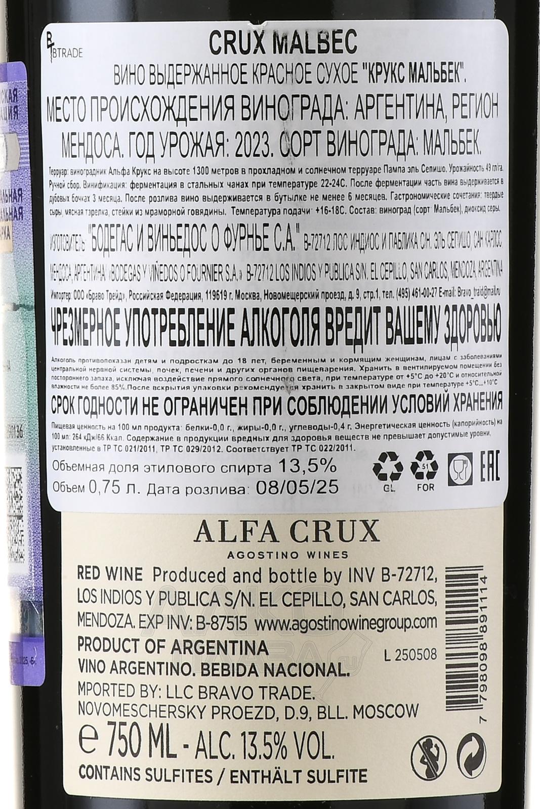 Красное сухое вино Crux Malbec 0,75 л производится в Аргентине, в провинции Мендоса, у подножия Анд. Предприятие работает с высокогорными участками долины Уко, где высота посадок достигает примерно 1000–1200 метров над уровнем моря. Каменистые аллювиальные почвы с примесью песка обеспечивают хороший дренаж. Значительная разница дневных и ночных температур способствует медленному созреванию ягод и формированию плотной структуры. Аргентинский флагманский виноград в этих условиях сохраняет яркий цвет и концентрированный аромат. Сбор урожая проводят при оптимальной зрелости. Ферментация проходит в стальных ёмкостях при контролируемой температуре. После мацерации следует выдержка в дубовых бочках.