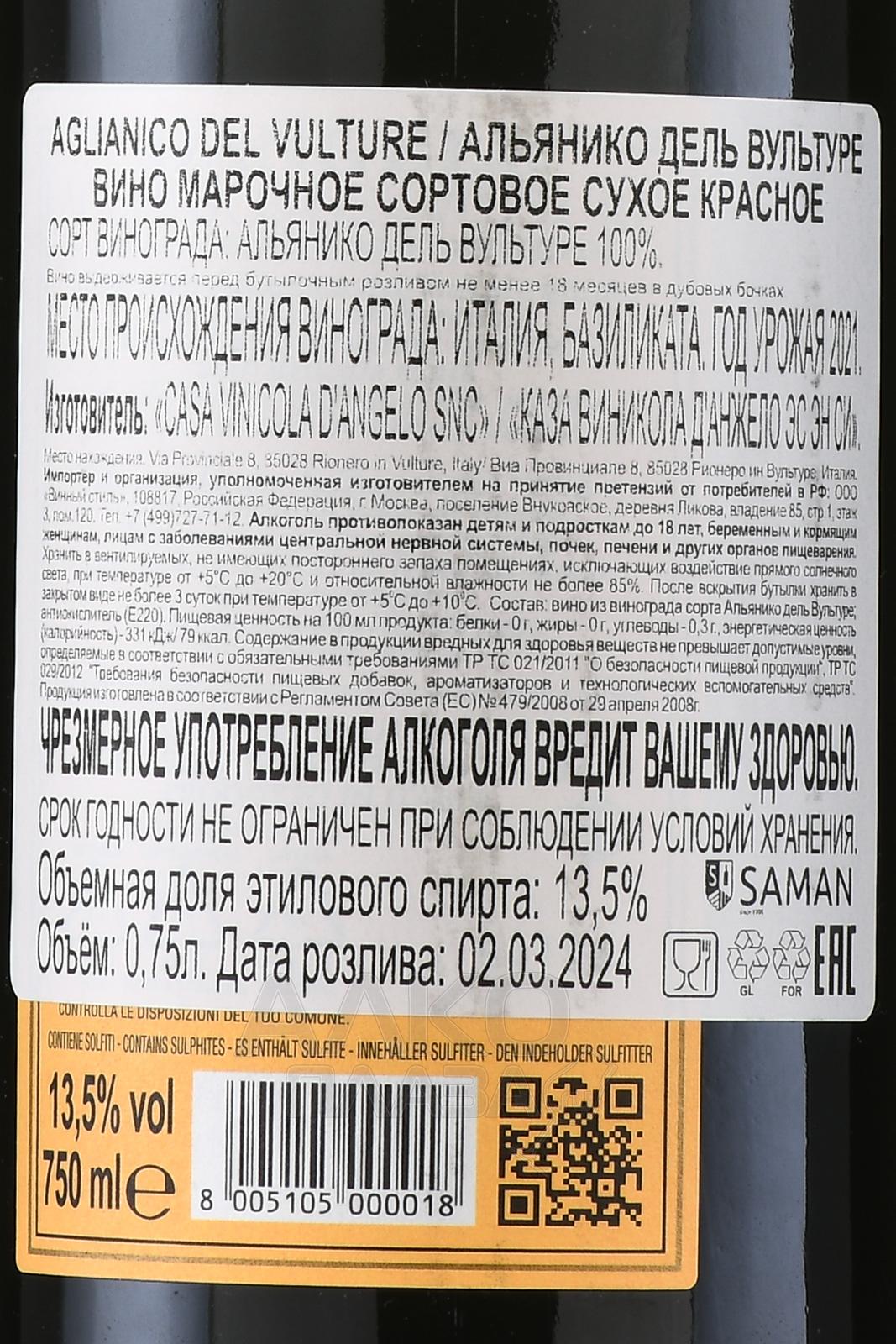 Вино D`Angelo Aglianico del Vulture 0.75 л создается на склонах потухшего вулкана Вультуре, где суровая природа Базиликаты формирует характер напитка. Виноград Альянико, выращенный на вулканических почвах на высоте около 400 метров над уровнем моря, впитывает контраст дневного тепла и прохладных горных ветров, благодаря чему достигается высокая концентрация и выразительность. Урожай собирают вручную в поздние сроки, отбирая только полностью зрелые ягоды. Ферментация проходит с контролем температуры для сохранения структуры и ароматической глубины, после чего напиток выдерживается в больших дубовых бочках около 18 месяцев. Такая технология придаёт ему зрелость, плотность и потенциал развития до 20 лет, раскрывая сложность вулканического терруара в каждом глотке.