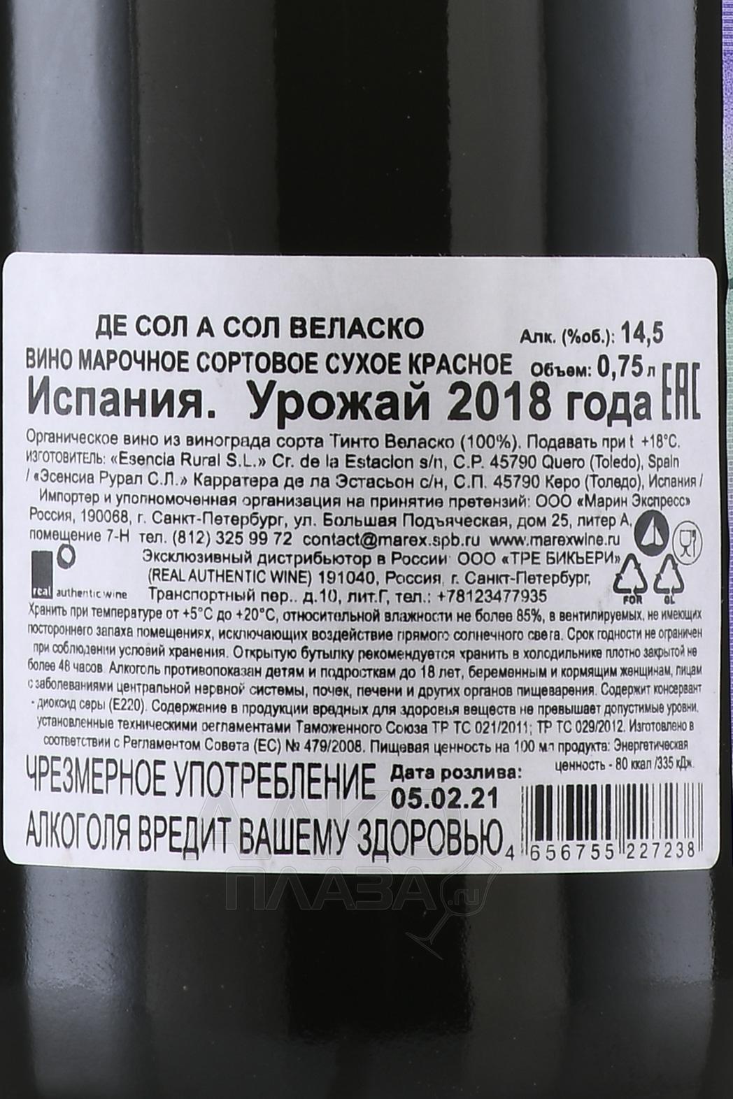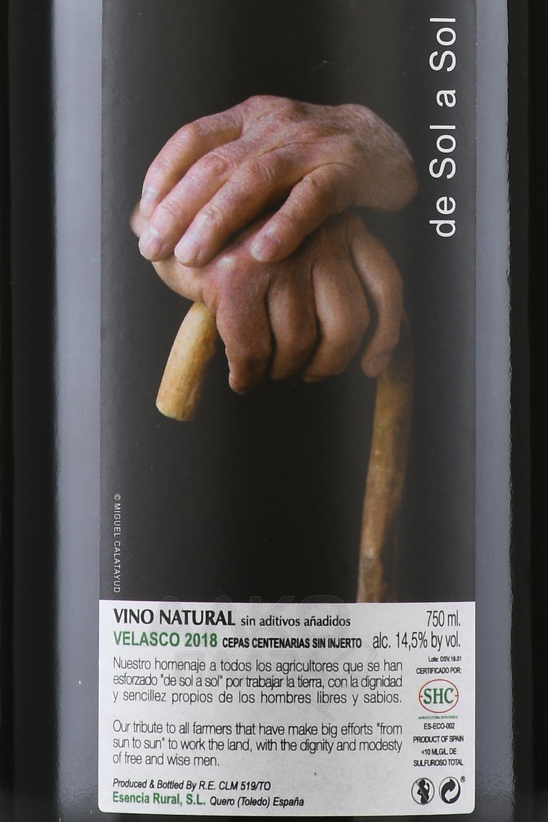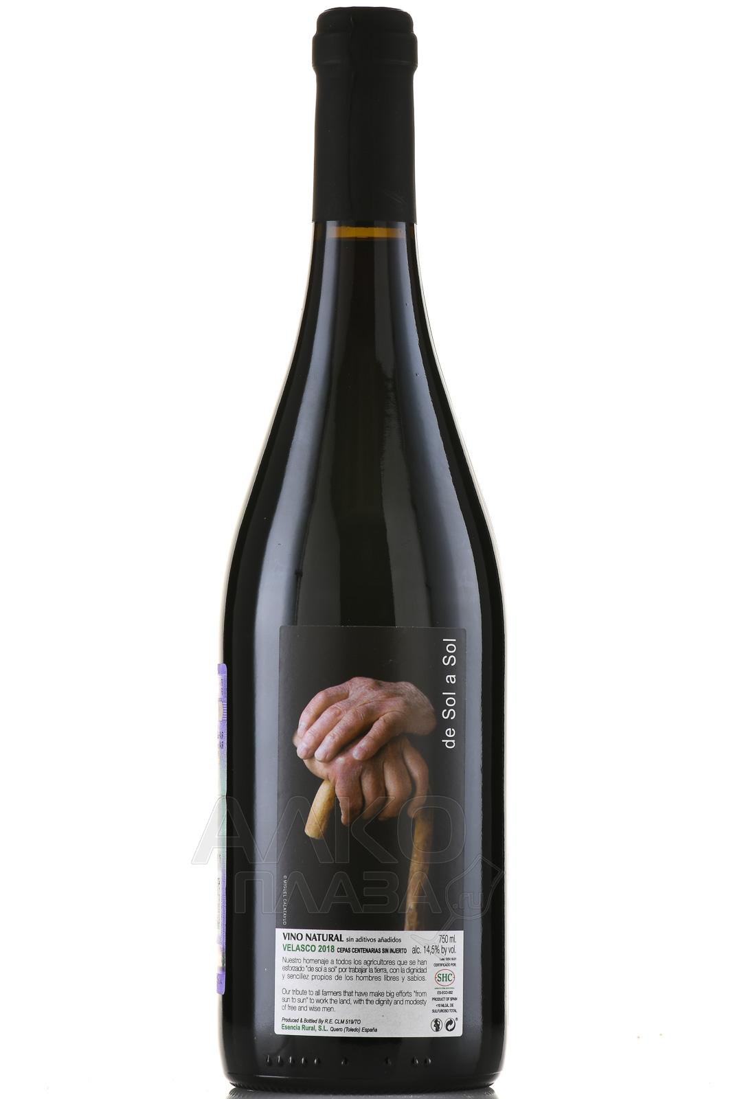 Красное сухое вино De Sol a Sol Velasco 0,75 л создано в Кастилии-Ла-Манче, регионе с континентальным климатом и большими суточными перепадами температур. Лозы сорта редкого местного сорта здесь растут на высоте более 700 метров над уровнем моря, в почвах с высоким содержанием известняка и глины. Урожай для винификации собирали вручную после жаркого засушливого лета, что обеспечило небольшие ягоды с концентрированным вкусом. Ферментация проходила с использованием натуральных дрожжей без добавления серы, а выдержка длилась около 30 месяцев в амфорах и нейтральных дубовых бочках, что позволило сохранить чистоту сорта и придать напитку глубокий характер. Образец выпускается ограниченным тиражом, что делает его ценным экземпляром испанского виноделия.