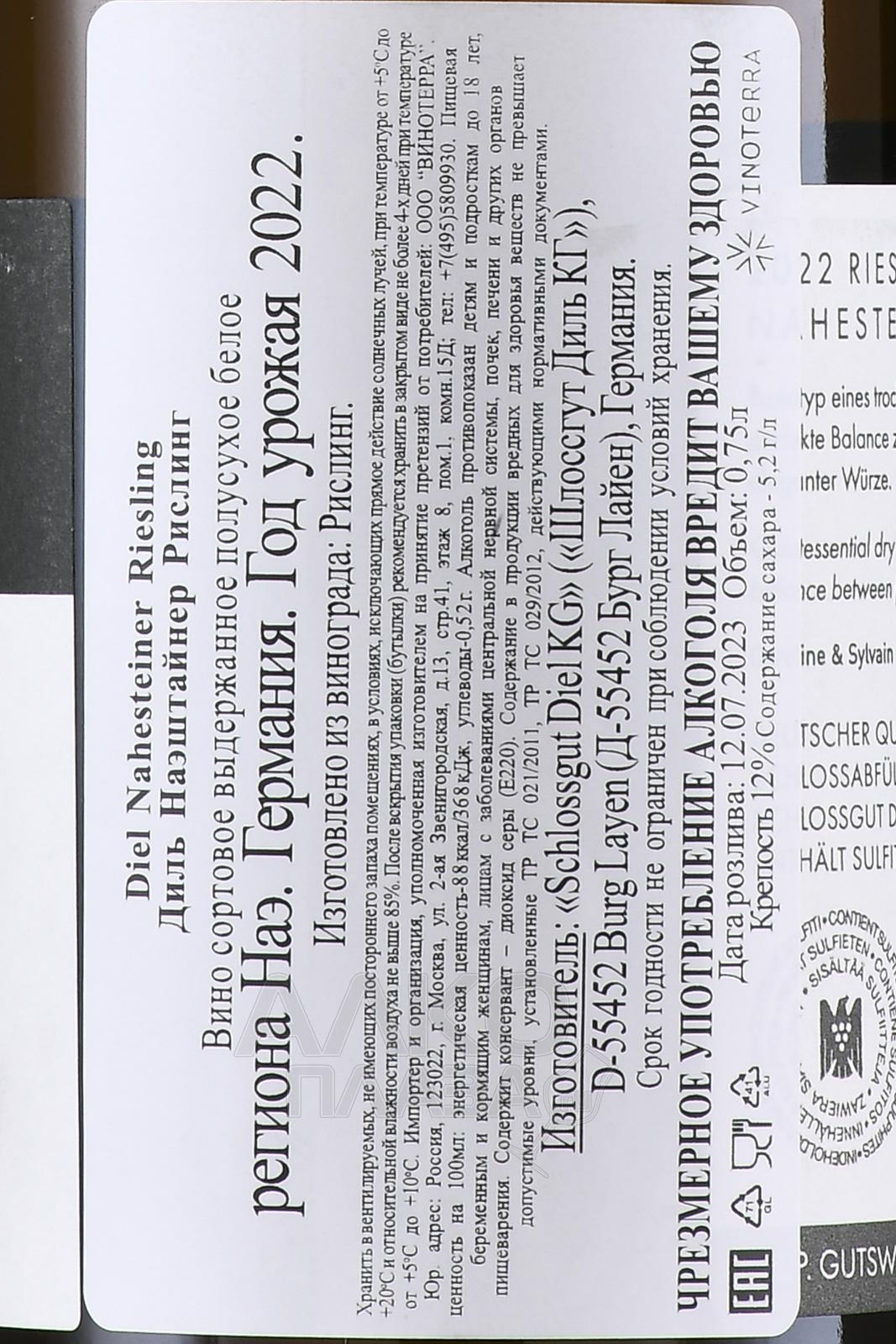 Белое полусухое вино Diel Nahesteiner Riesling 0,75 л из региона Германии Наэ — высококлассный алкоголь классического типа, содержащий урожай популярного в стране происхождения винограда с лоз южной экспозиции, возраст которых достигает сорока лет. Сбраживание осуществлялось под воздействием природных дрожжей, после него спиртное выдержали в дубовых бочонках и металлических чанах. Потенциал вина к хранению в бутылках солиден — его оценивают в 10-17 лет.
