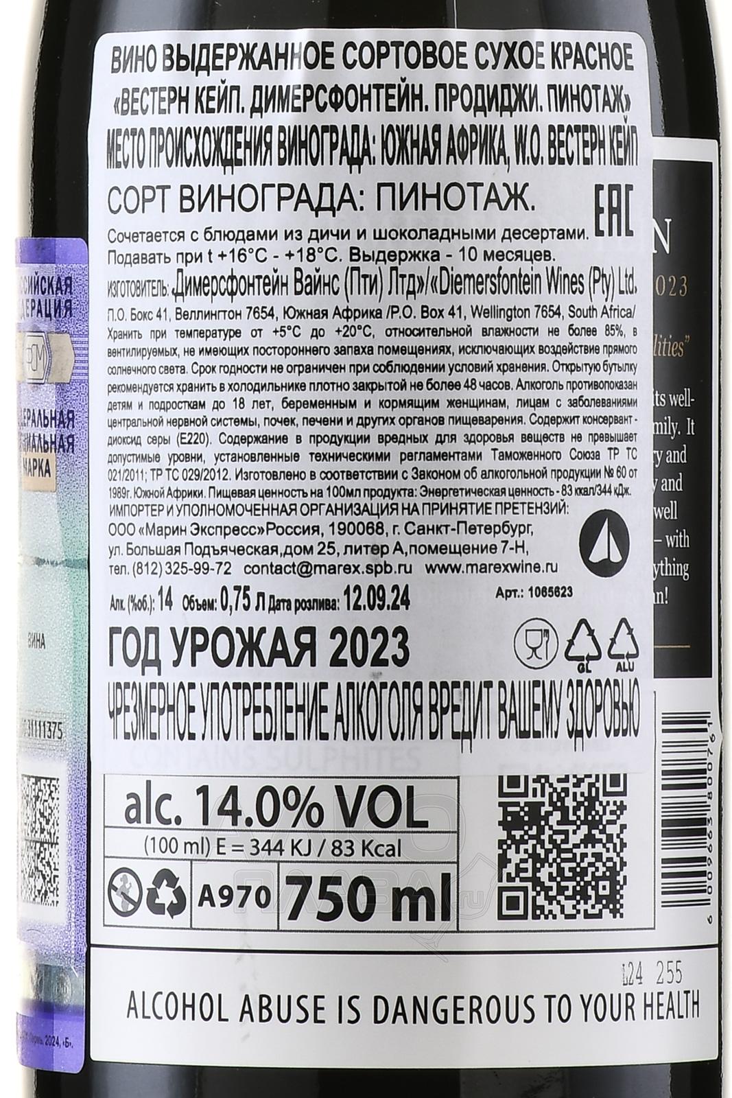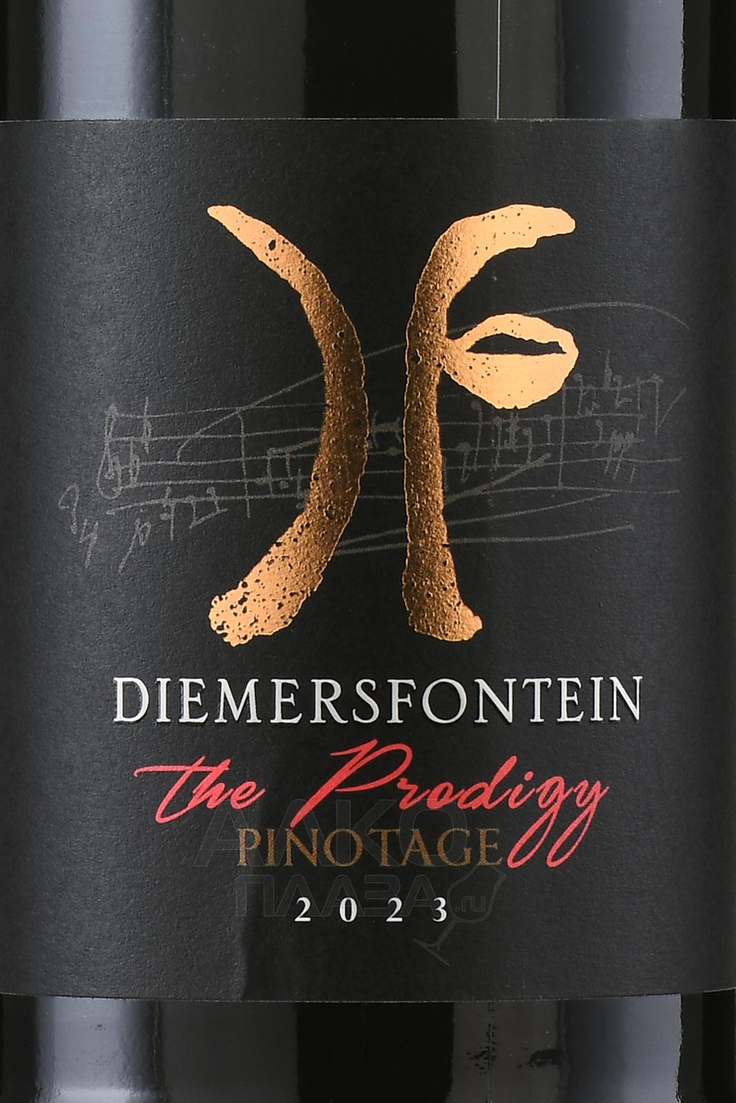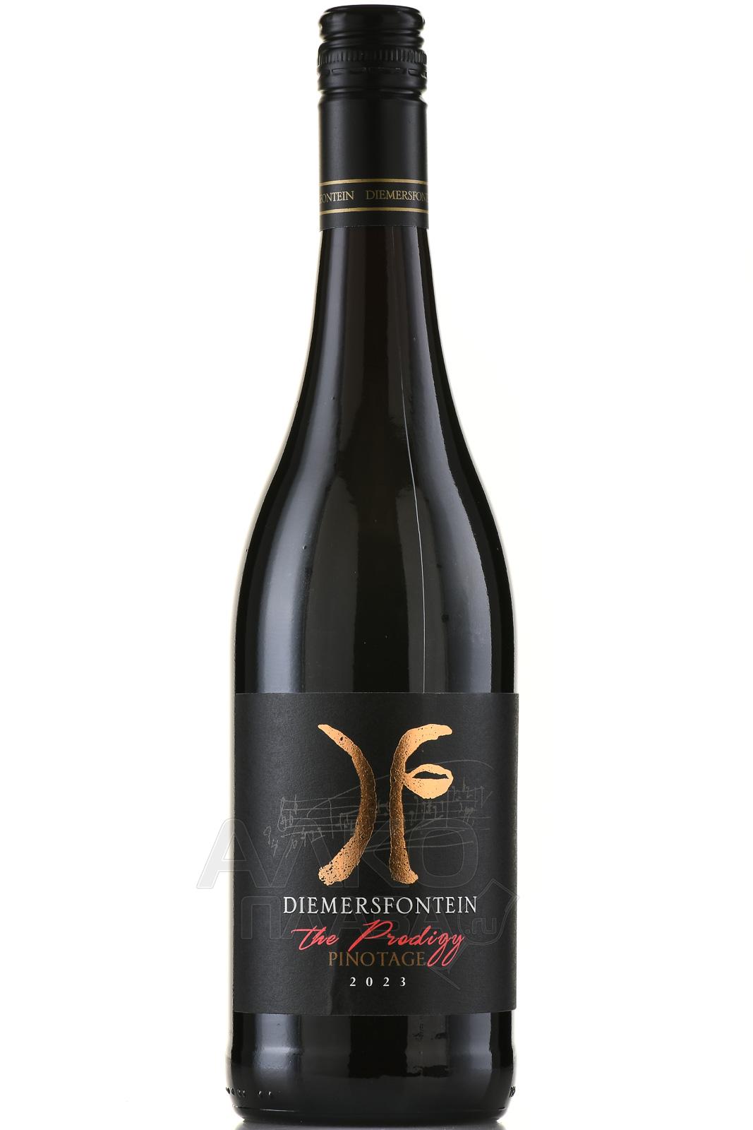 Красное сухое вино Diemersfontein The Prodigy Pinotage 0,75 л производится в ЮАР, в винодельческом хозяйстве, расположенном в зоне Веллингтон региона Западный Кейп. Виноградники находятся у подножия гор, на высотах с хорошей вентиляцией. Почвы — преимущественно гранитные и сланцевые, с хорошим дренажем. Климат — тёплый, с влиянием океанических бризов, что замедляет созревание ягод и способствует накоплению ароматических веществ. Эти условия формируют насыщенный стиль с выраженной фруктовой основой и характерными пряными мотивами. Напиток создаётся из отборного урожая. Ферментация проходит в стальных чанах с контролем температуры. После этого следует этап созревания в дубовых бочках, преимущественно из французского дуба, около десяти месяцев.