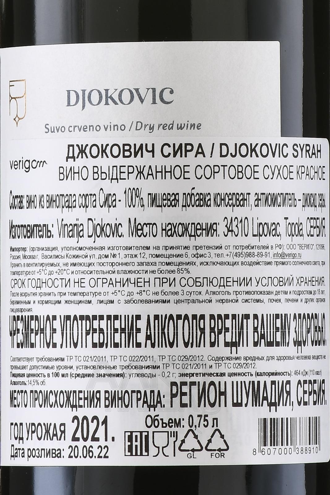 Красное сухое вино Djokovic Syrah 0,75 л создано в центральной Сербии, где виноградники занимают солнечные склоны с высотой около 300–400 метров над уровнем моря. Почвы в регионе преимущественно известняково-глинистые, что обеспечивает лозам устойчивый водный баланс и насыщение минералами. Климат здесь умеренно-континентальный: тёплое лето с температурой до +30 °С сменяется прохладной осенью, благодаря чему ягоды успевают набрать сахар и сохранить кислотность. Урожай собирают вручную, обычно в конце сентября, когда грозди достигают оптимальной зрелости. Винификация проходит по традиционной технологии: медленное брожение при контролируемой температуре и выдержка в дубовых бочках, придающая сложность и структуру.