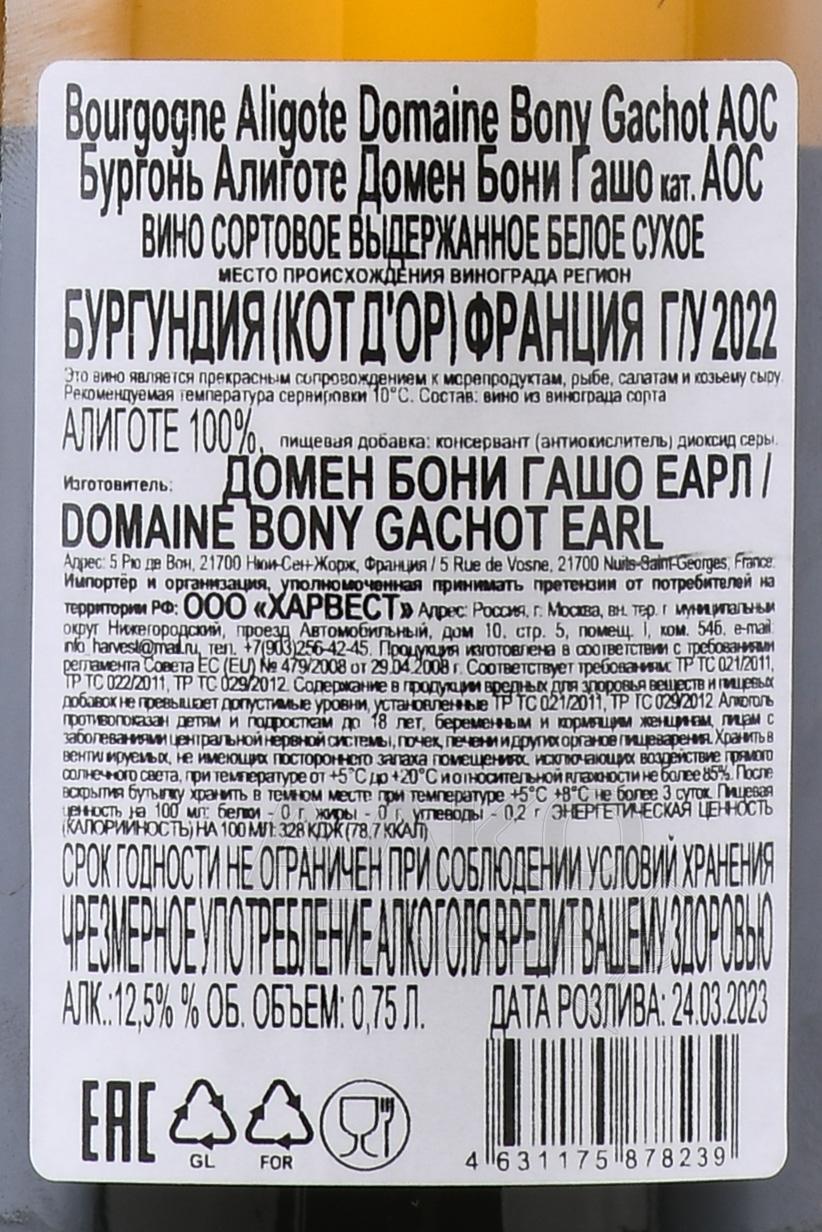 Белое сухое вино Domaine Bony Bourgogne Aligote AOC 0,75 л – миллезимный моносортовой образец в классических бургундских винодельческих традициях. Оно изготовлено исключительно из белого сорта винограда Алиготе. Лозы произрастают на известняковых почвах региона, которые способствуют развитию характерной минеральности напитка. Сезон, в течение которого созревал урожай, был теплым, с умеренными осадками, что позволило ягодам полностью созреть и сохранить оптимальный баланс кислотности и сахара. Плоды собирали вручную, обеспечив высокое качество отбора гроздей, а ферментация сока проходила в стальных емкостях при контролируемой температуре.