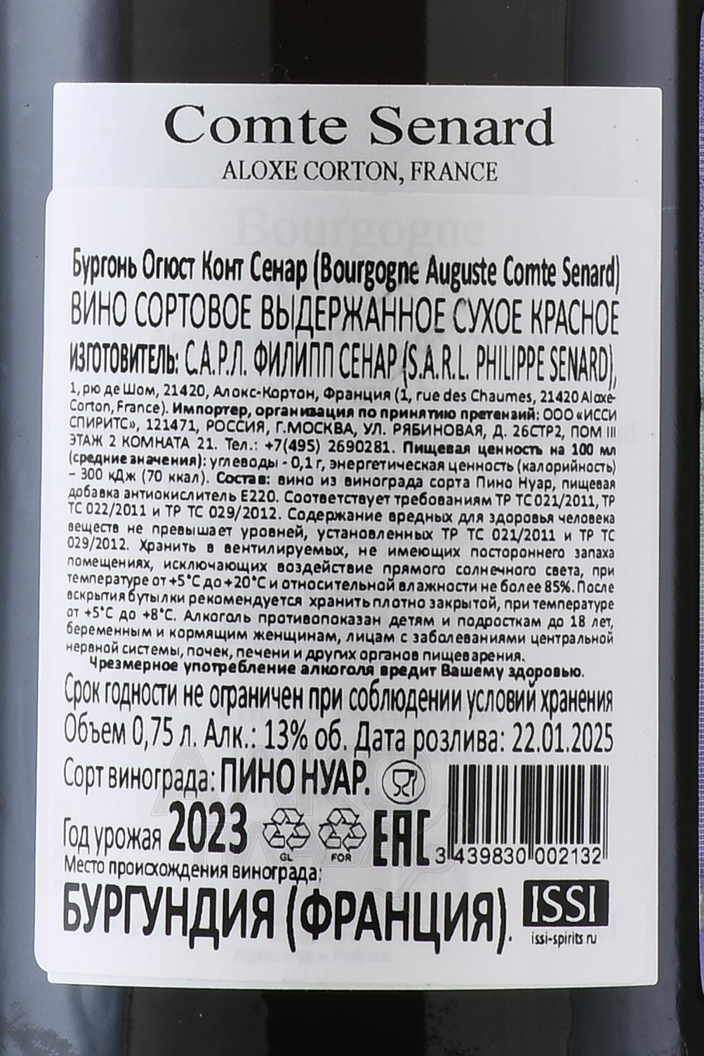 Вино Domaine Comte Senard Auguste 0.75 л — элегантное выражение бургундского терруара, созданное в честь сына владельца хозяйства. Напиток производится из Пино Нуар, выращенного на глинисто-известковых почвах Бургундии, где умеренный климат и разнообразие экспозиций участков формируют сложный и сбалансированный профиль. Урожай собирается вручную с лоз возрастом около 25 лет, культивируемых с применением органических методов. Виноград проходит двойную сортировку, после чего винификация проводится с использованием целых гроздей и натуральных дрожжей. Краткая холодная мацерация способствует извлечению цвета и танинов, ферментация длится до трёх недель, а последующая выдержка в дубовых бочках на протяжении 14 месяцев придаёт структуру и глубину, раскрывая потенциал выдержки не менее 5 лет.