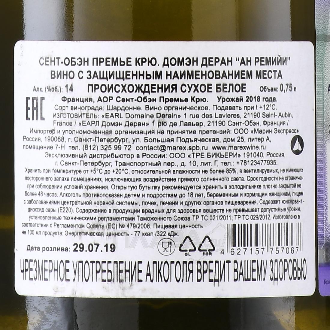 Вино Domaine Derain Saint-Aubin 1er Cru En Remilly AOC 0,75 л – премиальный белый сухой сорт из бургундского винограда Шардоне. Напиток создан из плодов, выращенных биодинамическими методами на лучших участках класса Премьер Крю в субрегионе Cote d`Or. Собранные вручную ягоды мягко прессуют и подвергают алкогольной ферментации в дубовых бочках. В тех же емкостях проходит и выдержка вина, которая длится 12-14 месяцев. Сорт бутилируется без фильтрации.