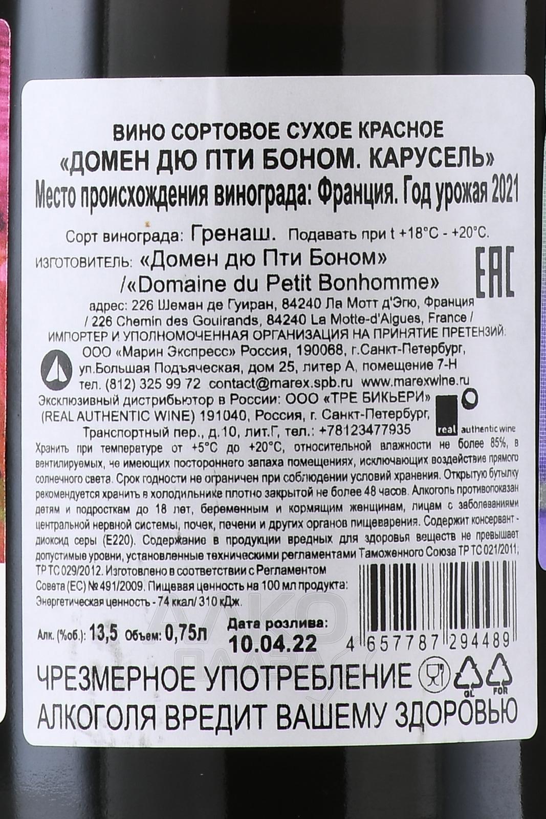 Красное сухое вино Domaine du Petit Bonhomme Carrousel 0,75 л создают на виноградниках Юго-Западной Франции, где хозяйство работает с участками, расположенными на смешанных почвах гравия, глины и известняка. Лозы занимают высоты около 200–300 м, что обеспечивает умеренный температурный режим и даёт ягодам возможность сохранять кислотность. Климат атлантического типа, с прохладными ночами и мягким летом, формирует равномерное созревание и выраженную сортовую глубину. Урожай собирают выборочно, ориентируясь на стабильность кожуры и плотность мякоти. Винификация проходит по классической схеме: ферментация в стальных ёмкостях при контролируемой температуре, затем стабилизация и отдых в больших ёмкостях до розлива.